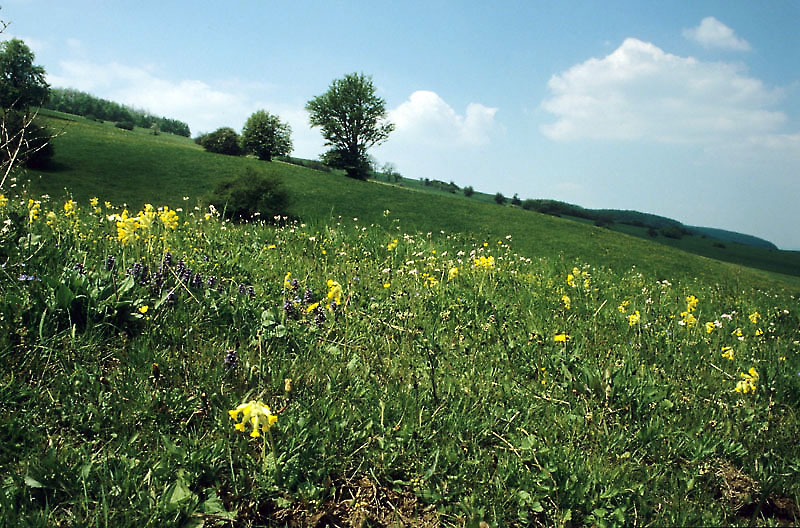 Magere Wiese (zeitweilig beweidet) auf Kalk (mit Wiesen-Schlüsselblume), erosionsgefährdeter Hang; Ith bei Capellenhagen; M5.89; GMK.mwe [FFH 6510]; Foto: O. v. Drachenfels