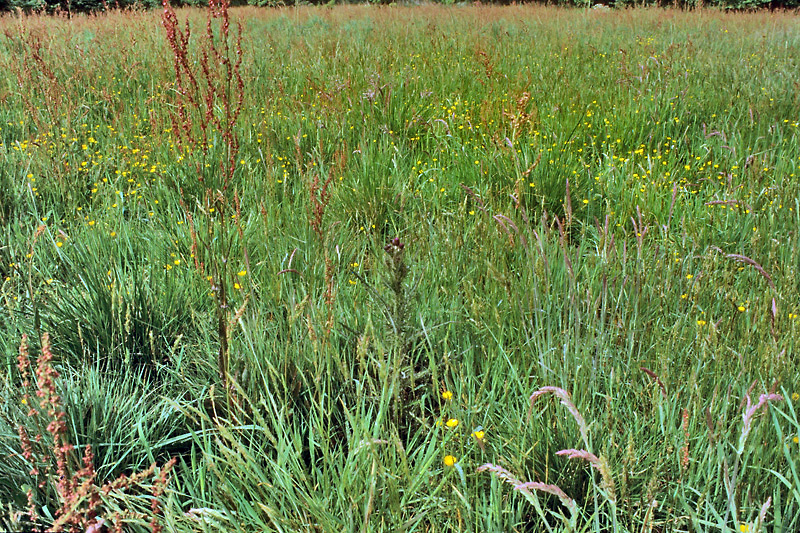 artenärmere, mäßig feuchte Wiese (mit Scharfem Hahnenfuß, Großem Sauerampfer u.a.) auf Niedermoor; Oldenburgische Geest; GMS.mo [FFH 6510]; Foto: O. v. Drachenfels