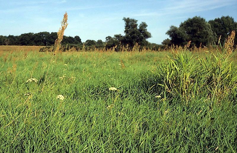 artenarme, vermutlich brachliegende Brenndolden-Wiese (mit blühender Brenndolde sowie viel Rohr-Glanzgras und Straußblütigem Sauerampfer); Aue der unteren Mittelelbe bei Stiepelse; A8.95; GFB.bü [FFH 6440]; Foto: O. v. Drachenfels