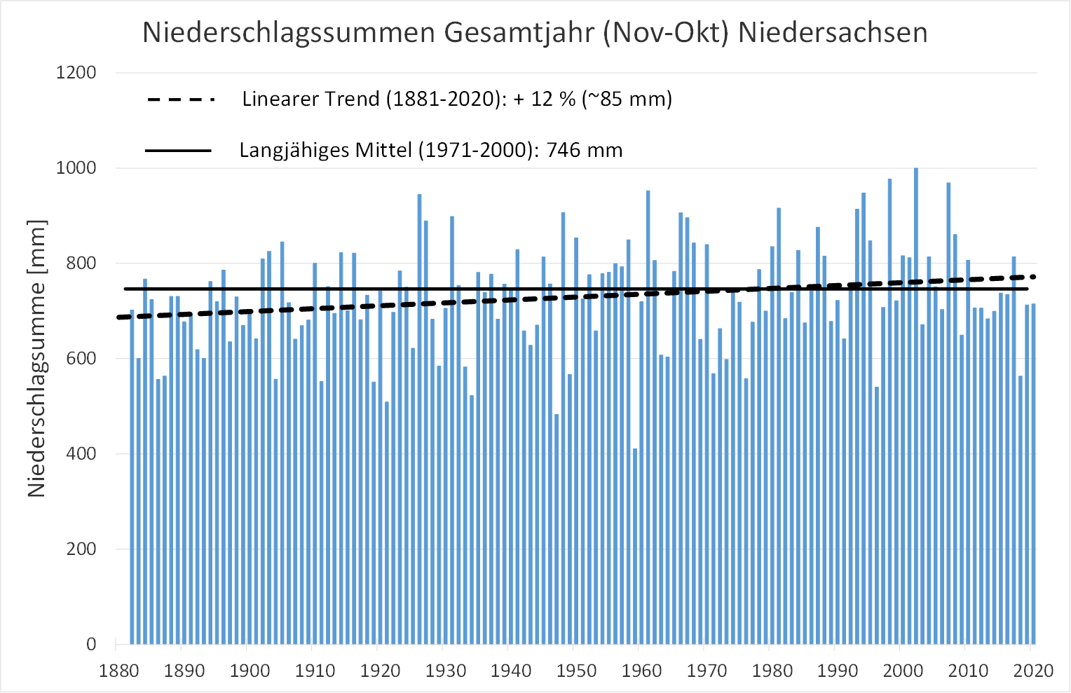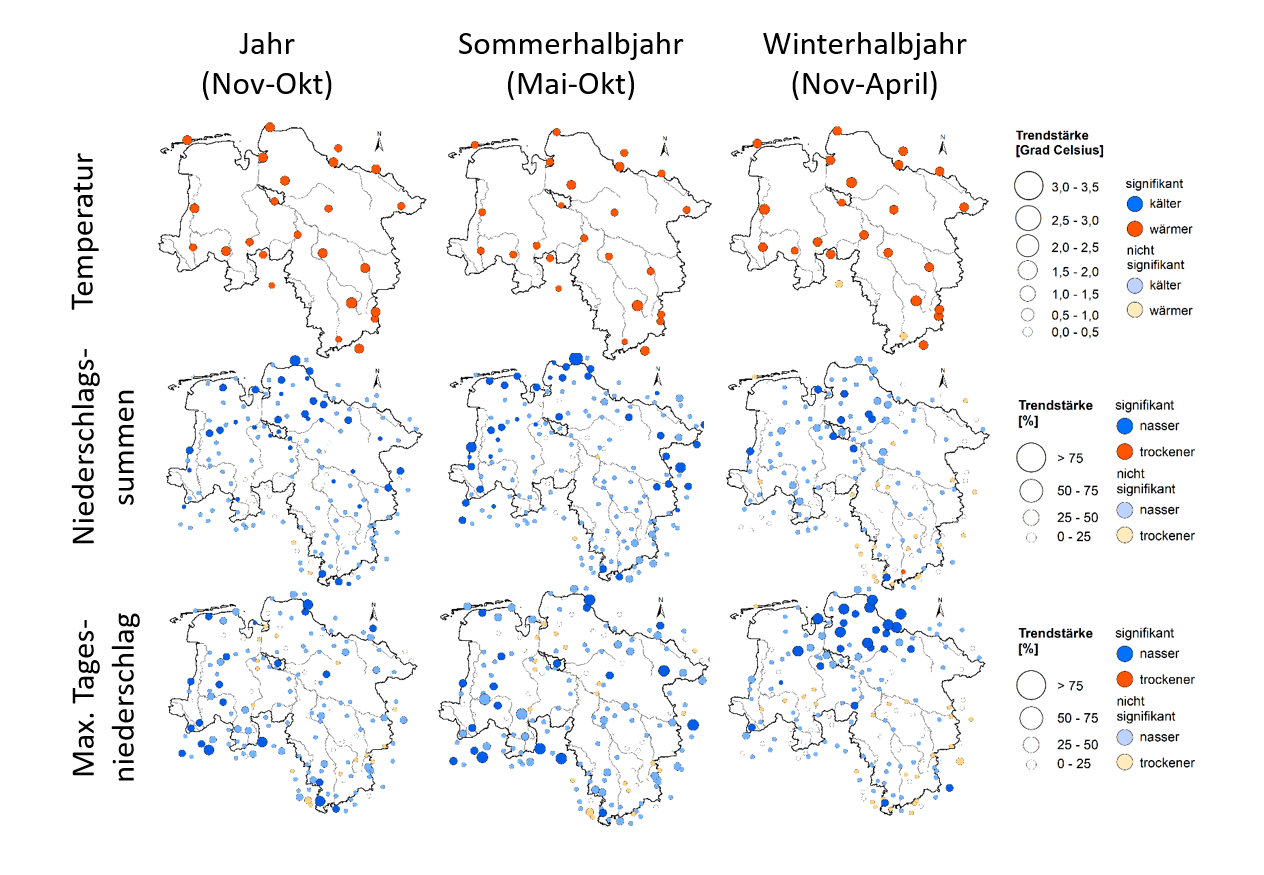 Grundlage für die Untersuchung der vergangenen Verhältnisse sind Stationsmessdaten des Deutschen Wetterdienstes in ganz Niedersachsen. Es wurden Trenduntersuchungen für verschiedene Indizes und Jahreszeiten durchgeführt, sowohl als Gebietsmittel für Niedersachsen als auch anhand der einzelnen Stationszeitreihen.