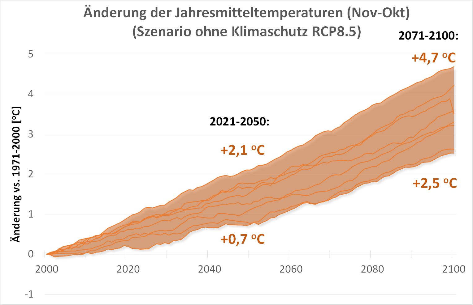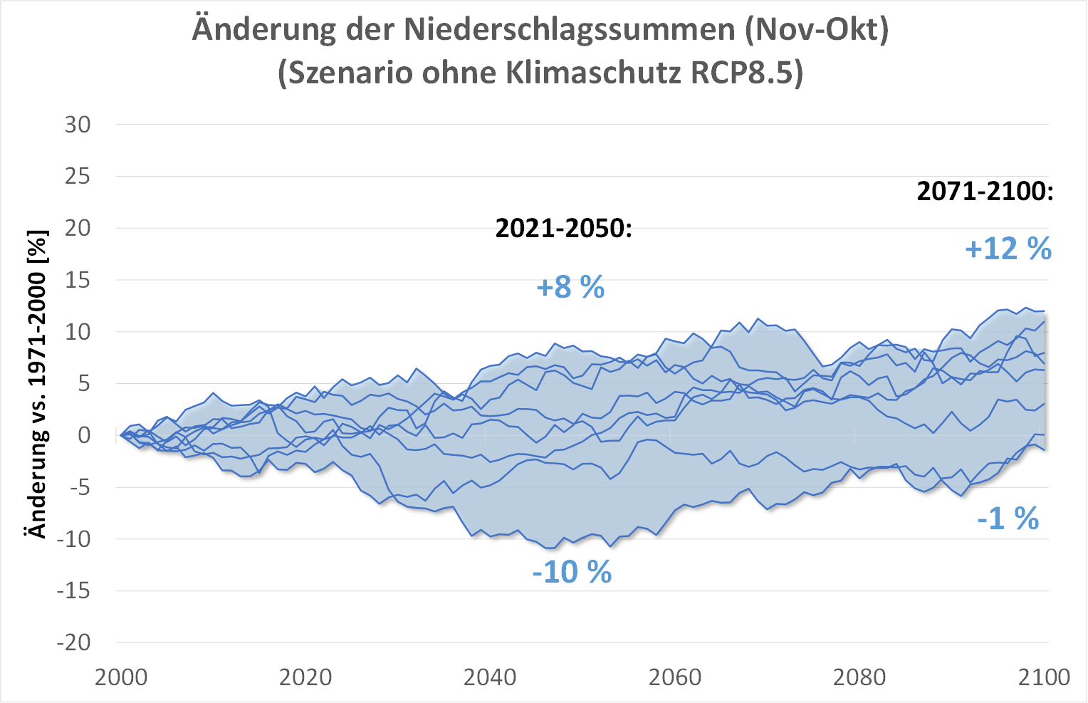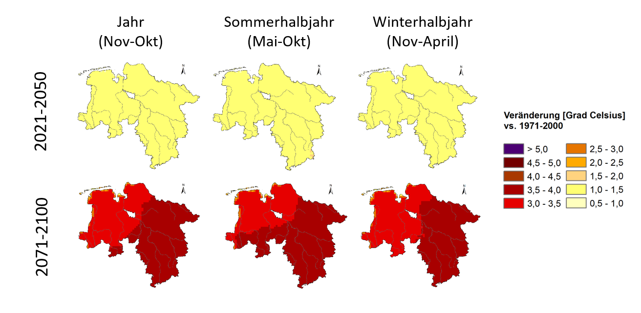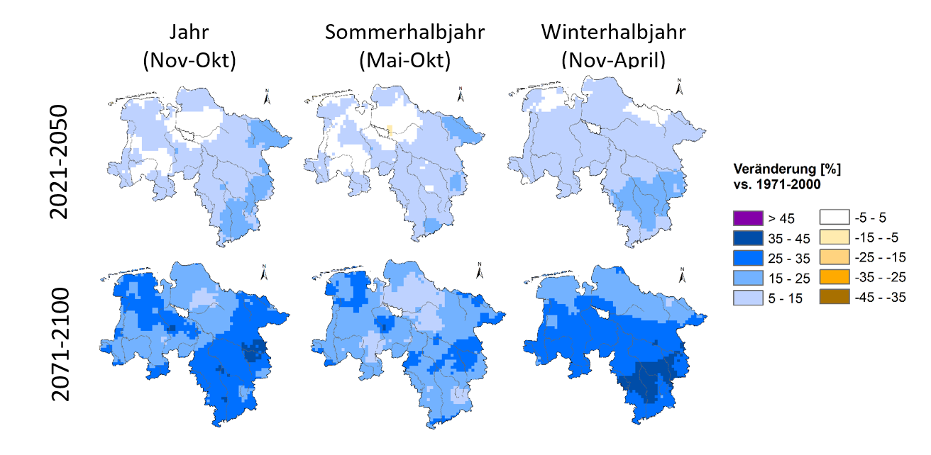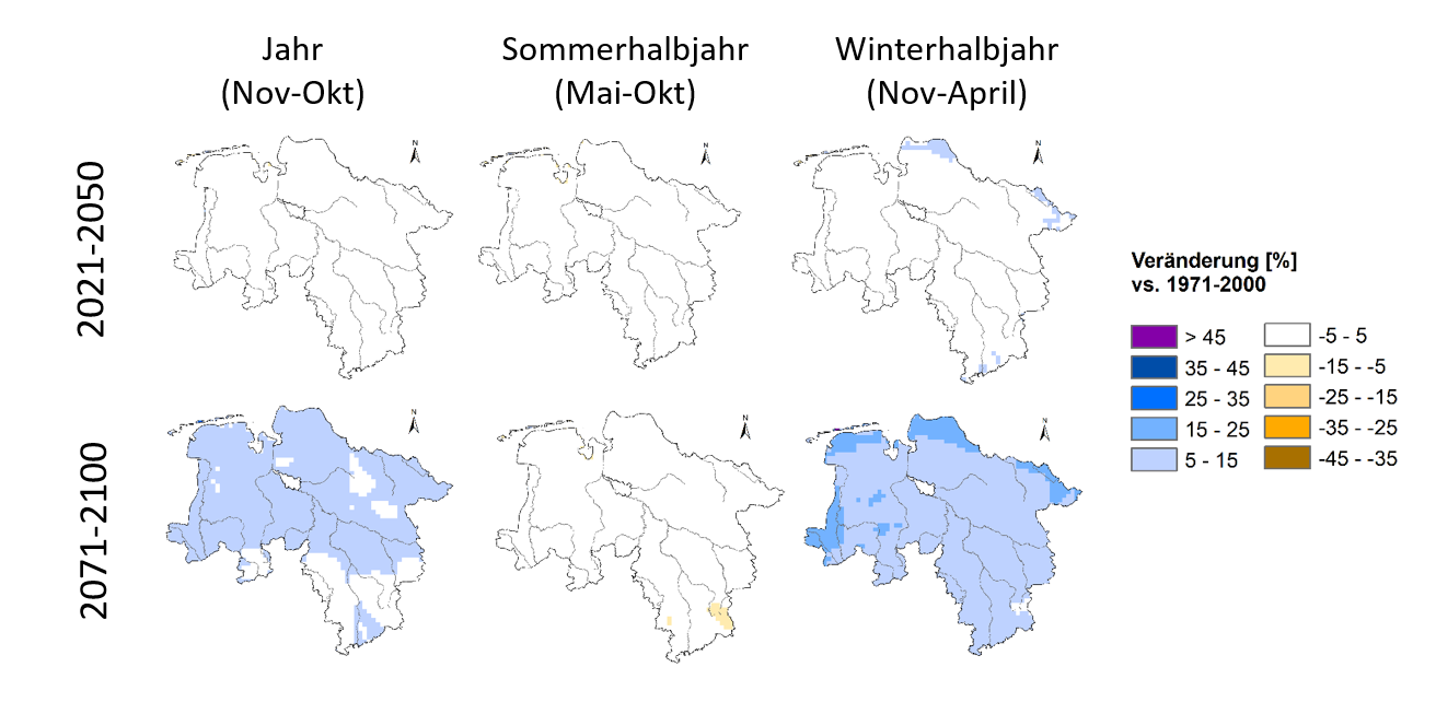 Die Berechnung der zukünftigen Veränderungen erfolgte zunächst als 30jähriges Mittel für jedes Modell für die Zeitabschnitte 2021-2050 (nahe Zukunft) und 2071-2100 (ferne Zukunft), jeweils gegenüber dem Referenzzeitraum 1971-2000. Das Ergebnis des verwendeten Modell-Ensembles ist eine Bandbreite von Änderungswerten für jeden 30jährigen Zukunftsabschnitt.