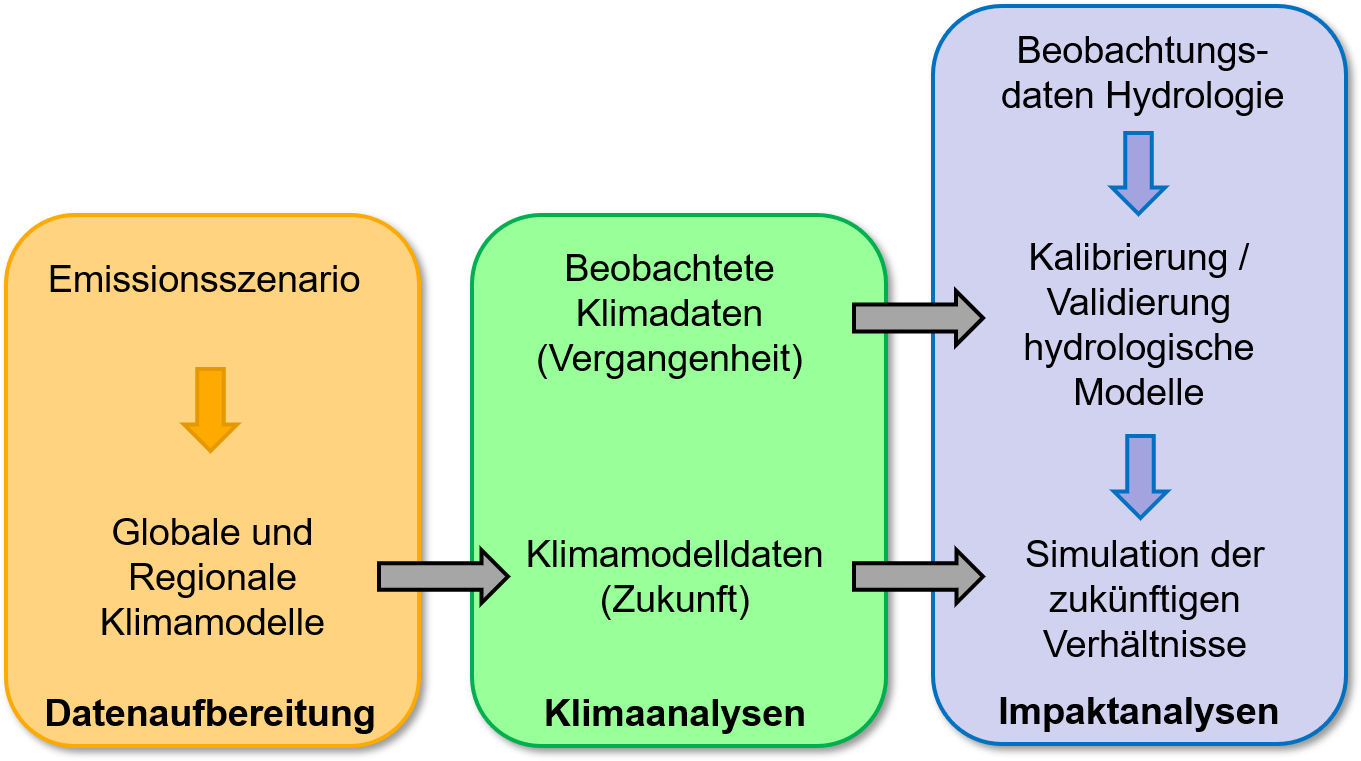 Anhand von beobachteten Niederschlags- und Klimadaten an Messstationen des Deutschen Wetterdienstes (DWD) wurden die klimatischen Trends der Vergangenheit analysiert. Die Betrachtung der zukünftigen Klimaverhältnisse erfolgte bisher auf Basis von zwei Treibhausgas-Szenarien. In früheren Projektphasen (Phase 1 bis 5) wurde zunächst das gemäßigte Szenario SRES-A1B herangezogen. In den späteren Projektphasen (Phase 6 bis 7) lag der Fokus auf dem Szenario ohne Klimaschutz RCP8.5. In der Projektphase 8 wird zusätzlich auch ein Szenario mit Klimaschutz (RCP2.6) betrachtet. Mit Hilfe von Ensembles verschiedener globaler und regionaler Klimamodelle (aus den Projekten EURO-CORDEX und ReKliEs-De) werden die zukünftigen Veränderungen bis zum Jahr 2100 ermittelt.
