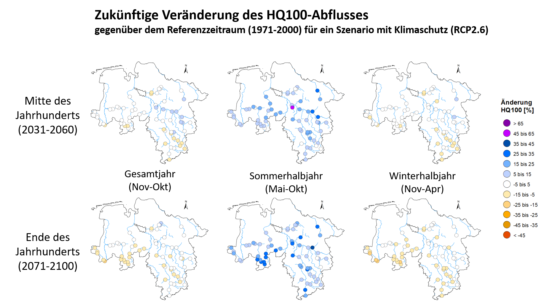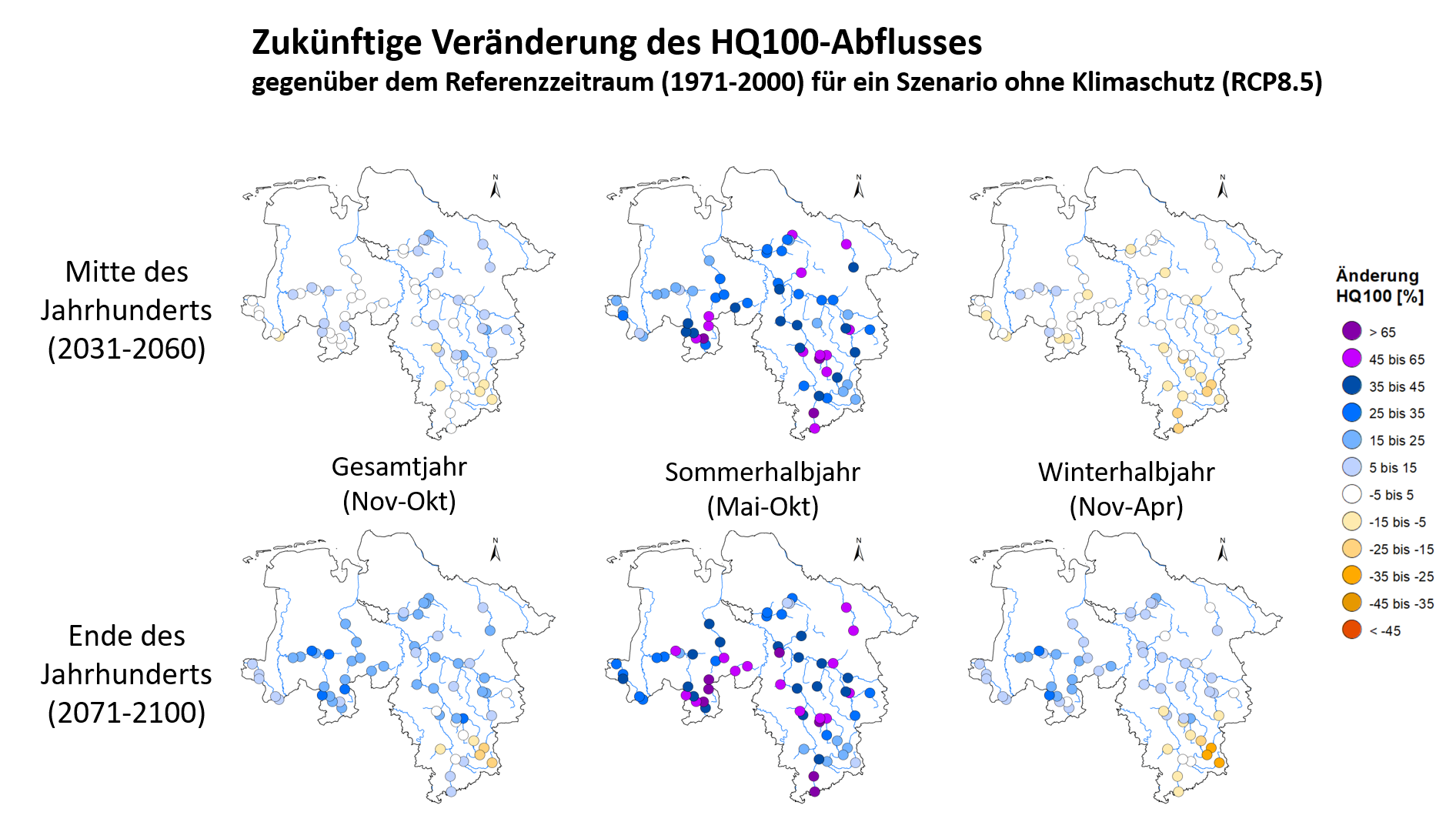 Die zukünftige Hochwassersituation in Niedersachsen lässt erkennen, dass die prozentualen Zunahmen der Abflussmengen bei einem hundertjährlichen Hochwasser (HQ100) zur Mitte des Jahrhunderts in beiden Szenarien im Sommerhalbjahr am stärksten ausfallen, während im Winterhalbjahr kaum Veränderungen zu erwarten sind. In der fernen Zukunft am Ende des Jahrhunderts gibt es deutliche Zunahmen der Scheitelabflüsse in beiden Halbjahren an fast allen Pegeln in Niedersachsen unter dem Szenario ohne Klimaschutz (RCP8.5), wobei auch hier das Sommerhalbjahr am stärksten in Erscheinung tritt. Unter dem Szenario mit Klimaschutz (RCP2.6) treten die Zunahmen im Sommer schwächer in Erscheinung, während es im Winter insgesamt sogar einen leichten Rückgang der Scheitelabflüsse geben kann.