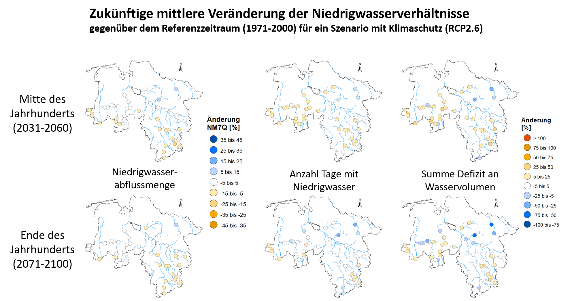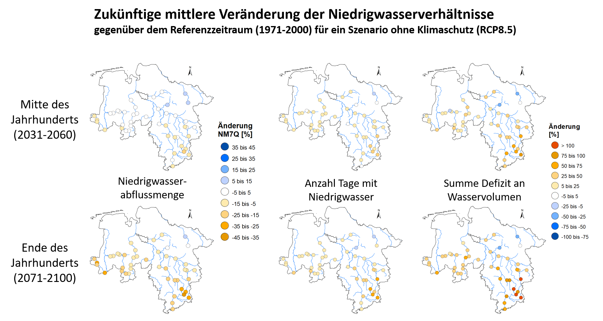 Zukünftig findet bis zur Mitte des 21. Jahrhunderts bereits eine weitere Verschärfung der Niedrigwassersituation in den meisten Regionen von Niedersachsen im Vergleich zum Referenzzeitraum (1971 - 2000) unter beiden Klimaszenarien statt. Leichte Schwerpunkte liegen dabei in der südlichen Landeshälfte. Bis zum Ende des Jahrhunderts kommt es dann unter dem Szenario ohne Klimaschutz (RCP8.5) zu einer landesweit deutlichen Verschärfung der Niedrigwasserverhältnisse, auch hier wieder mit Schwerpunkt in den südlichen Landesteilen. Unter einem Szenario mit Klimaschutz (RCP2.6) würde sich die Situation dagegen nicht weiter verschärfen, regional käme es sogar wieder zu einer leichten Entspannung.