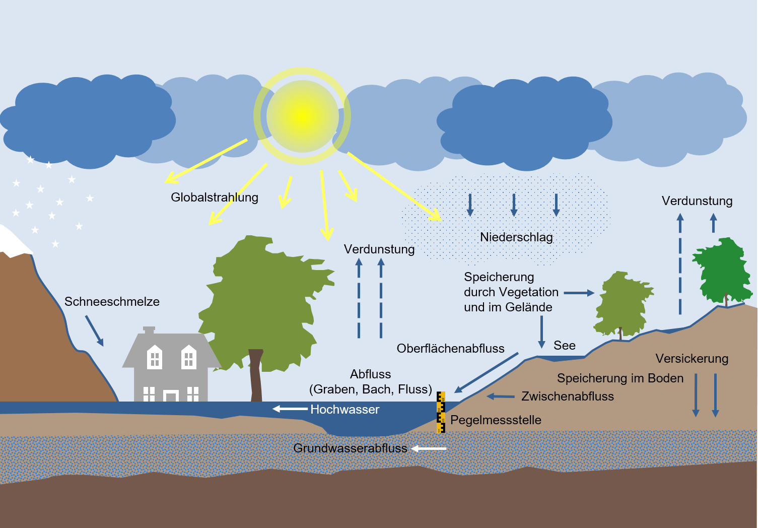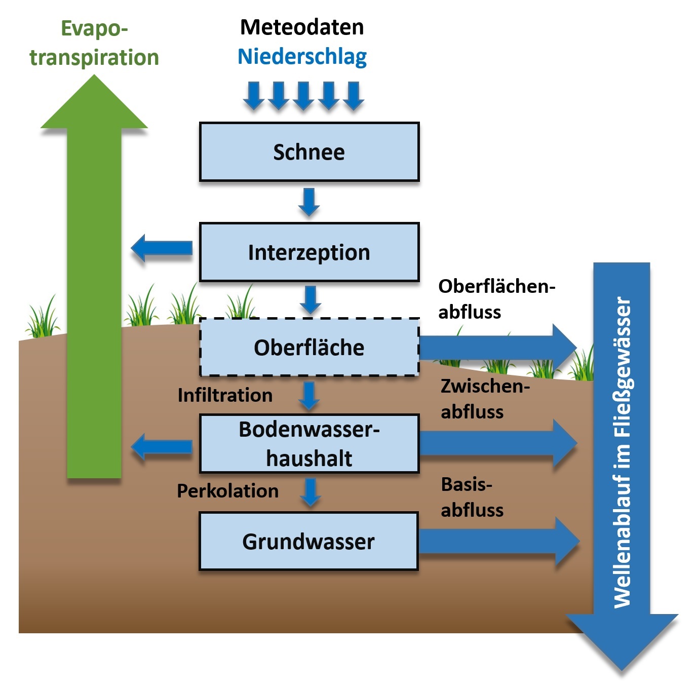 Alles Wasser auf der Erde befindet sich in einem steten Kreislauf. Die ständige Orts- und Zustandsänderung des Wassers wird angetrieben durch die Energiezufuhr der Sonne und durch die Wirkung der Schwerkraft. Das Zusammenwirken der Elemente des Wasserkreislaufes, wie Niederschlag, Abfluss, Verdunstung, Speicherung und Aufbrauch in einem vorgegebenen Gebiet kann als Wasserhaushalt definiert werden. Mit mathematischen Computermodellen, sogenannten „Wasserhaushaltsmodellen“, können alle relevanten landflächenbezogenen Komponenten des Wasserkreislaufes simuliert und bestimmt werden.