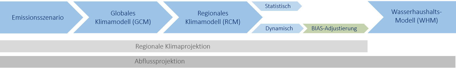Mit Klimamodellen werden nicht nur die klimatischen Verhältnisse der Zukunft simuliert, sondern auch jene der Vergangenheit. In vielen Fällen lassen sich systematische Abweichungen zwischen der meteorologischen Beobachtung (Messung) und der mit dem Klimamodell simulierten meteorologischen Vergangenheit feststellen. Eine solche als „Bias“ bezeichnete Abweichung kann beispielsweise sein, dass die tatsächlich gemessenen Temperaturen systematisch niedriger sind, als diejenigen, die mit einem Klimamodell für denselben Zeitraum simuliert wurden. Durch einen Vergleich der Klimamodelldaten mit den tatsächlich gemessenen Werten können die Art und Größe der systematischen Abweichungen bestimmt werden. Anschließend können die Klimaprojektionen mit mathematischen Verfahren korrigiert (Bias-Korrektur) und an das Wasserhaushaltsmodell übergeben werden.