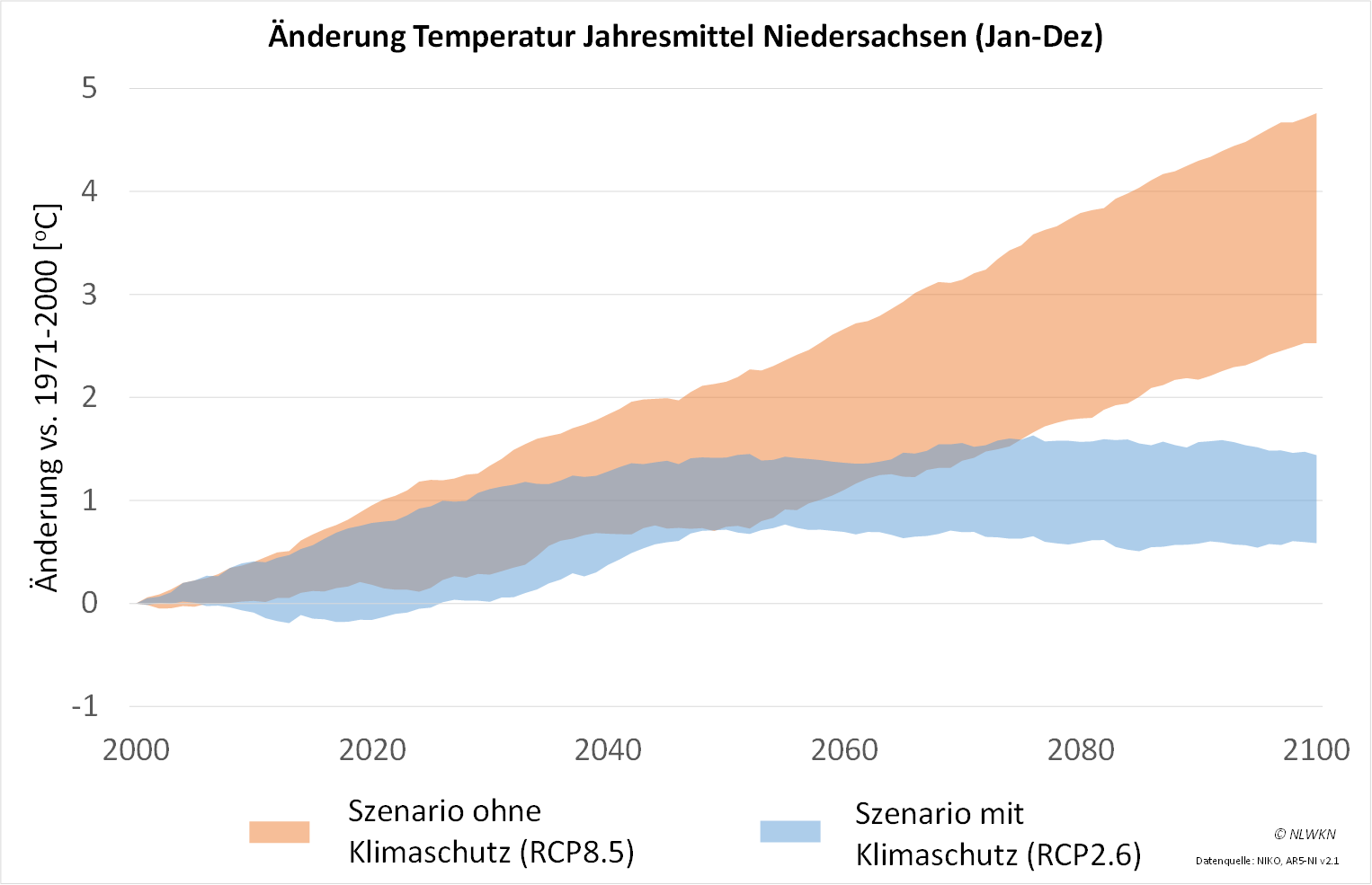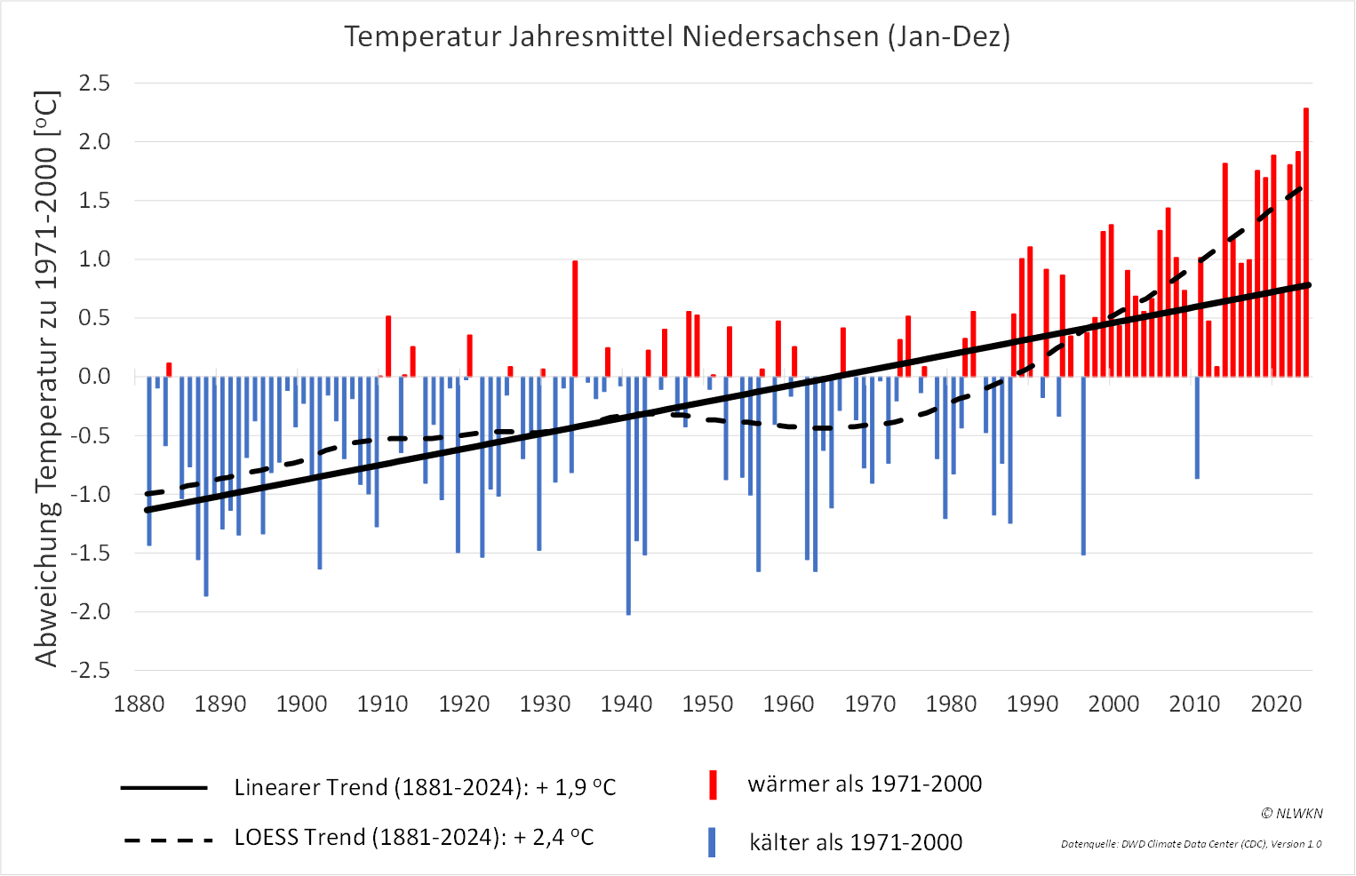 Die Temperaturen haben in Niedersachsen in der Vergangenheit in allen Jahreszeiten zugenommen. Im Jahresmittel sind sie seit Ende des 19. Jahrhunderts (1881-2024) je nach Analysemethode um +1,9 °C (linearer Trend) bzw. +2,4 °C (LOESS-Filter) gestiegen. Zukünftig muss je nach betrachtetem Klimaszenario mit einer weiteren Zunahme der Temperaturen bis zum Ende des Jahrhunderts gerechnet werden. Unter einem Szenario mit konsequentem globalen Klimaschutz (RCP2.6) lägen die Zunahmen zwischen +0,6 und +1,4 °C gegenüber dem Zeitraum von 1971-2000. Unter einem Szenario ohne Klimaschutz (RCP8.5) lägen die Zunahmen zwischen +2,5 und +4,8 °C.