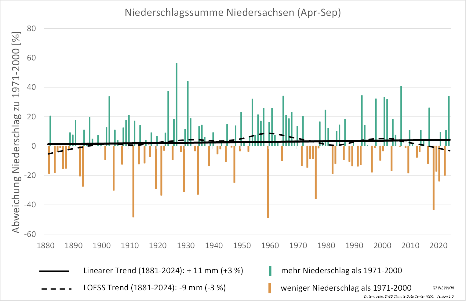 Veränderung der Niederschlagssummen im Sommerhalbjahr (April-September) in Niedersachsen von 1881 bis 2024