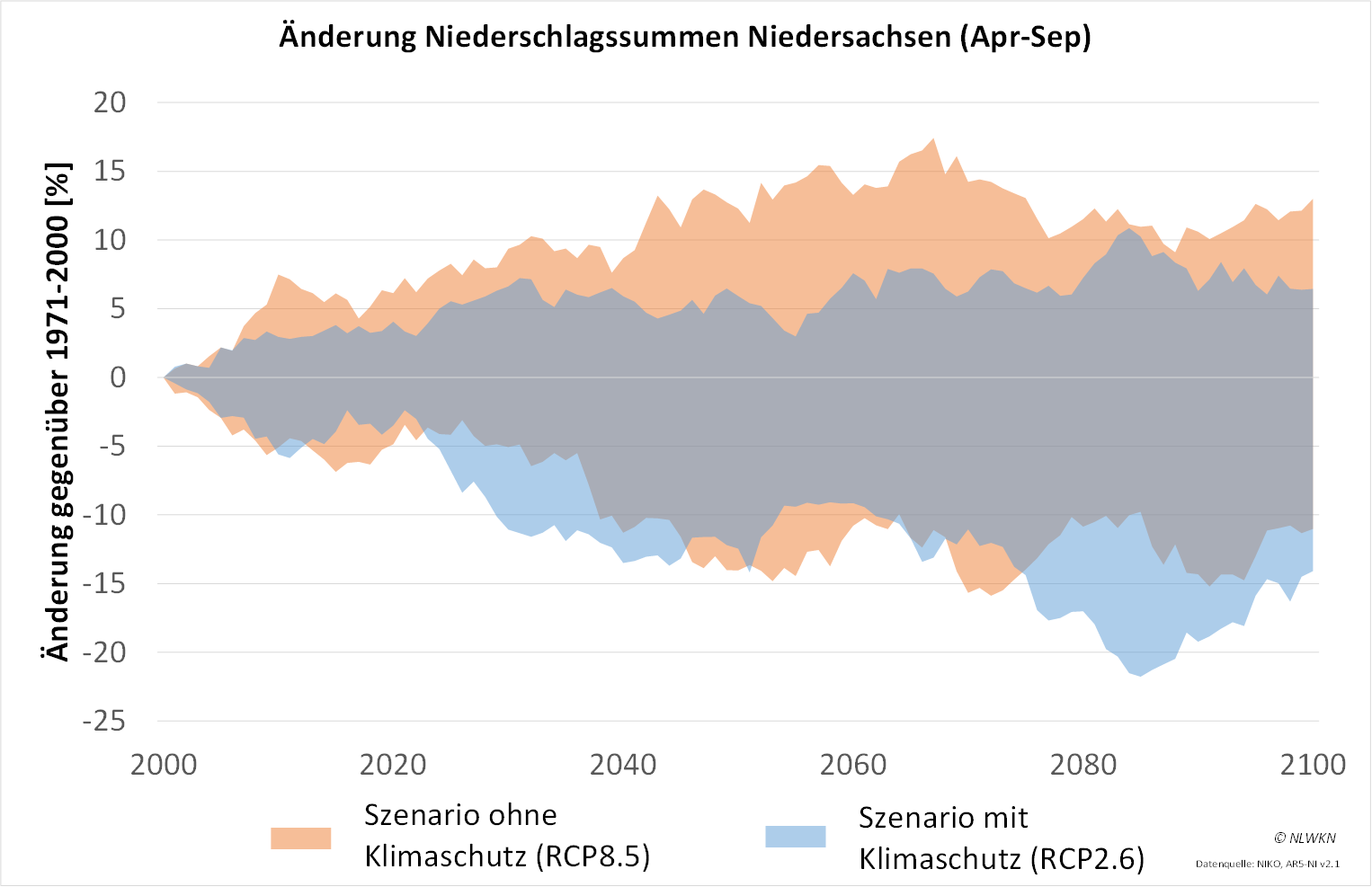 Die Gesamtniederschläge haben sich in Niedersachsen je nach Jahreszeit unterschiedlich entwickelt. Im Sommerhalbjahr (SoHJ, Apr-Sep) haben sie sich zwischen 1881 und 2024 nur wenig verändert (Linearer Trend: +11 mm bzw. +3 %; LOESS-Filter: -9 mm bzw. -3 %). Dabei fällt beim LOESS-Filter die Trockenheit der letzten Jahre besonders auf. Zukünftig sind die Tendenzen bei beiden Szenarien eher uneindeutig. Unter RCP2.6 liegen die Veränderungen am Ende des Jahrhunderts zwischen -14 und +6 %, unter RCP8.5 zwischen -11 und +13 %, jeweils gegenüber 1971-2000.