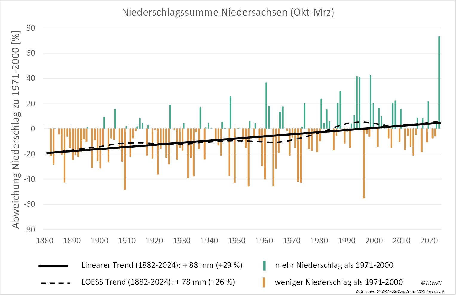 Veränderung der Niederschlagssummen im Winterhalbjahr (Oktober-März) in Niedersachsen von 1881 bis 2024