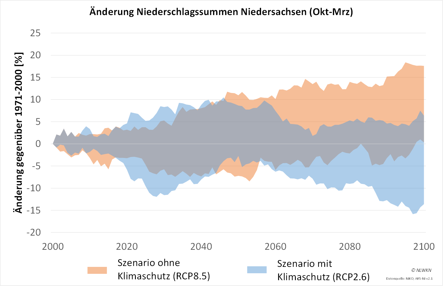 Im Winterhalbjahr (WiHJ, Okt-Mrz) haben die Niederschläge zwischen 1881 und 2024 relativ deutlich zugenommen (Linearer Trend: +88 mm bzw. +29 %; LOESS-Filter: +78 mm bzw. +26 %). Dabei gab es nach dem LOESS-Filter jeweils mehrjährige Phasen in den letzten Jahrzehnten die unterdurchschnittlich wenig bzw. überdurchschnittlich viel Jahresniederschlag aufweisen. Zukünftig zeigen sich zwischen den beiden Szenarien etwa ab der Mitte des Jahrhunderts unterschiedliche Entwicklungstendenzen. Während beim RCP2.6 die Winterniederschläge zum Ende des Jahrhunderts eher leicht zurückgehen würden (-14 bis +6 %) nähmen sie beim RCP8.5 eher zu (0 bis +18 %), jeweils gegenüber 1971-2000.