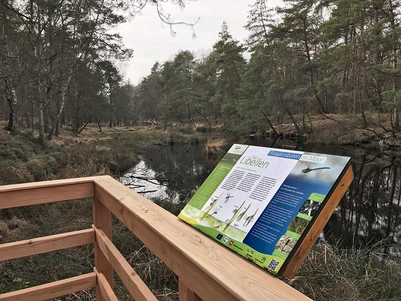 Insgesamt wurden Ende 2014 im LIFE-Projektgebiet 40 Infotafeln zu unterschiedlichen Themen aufgestellt. Räumliche Schwerpunkte waren die beiden Aussichtstürme im Bissendorfer Moor und der Bereich des seinerzeit geplanten Moorerlebnispfades.