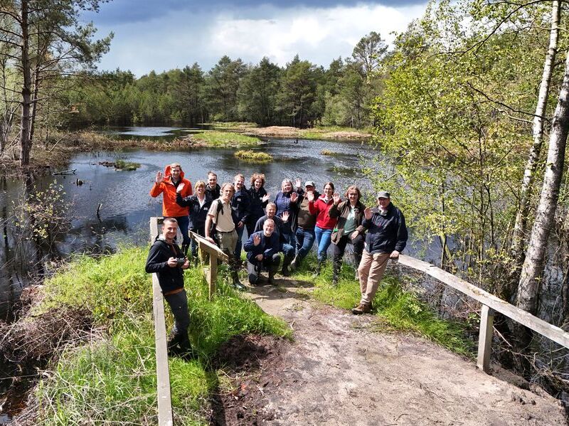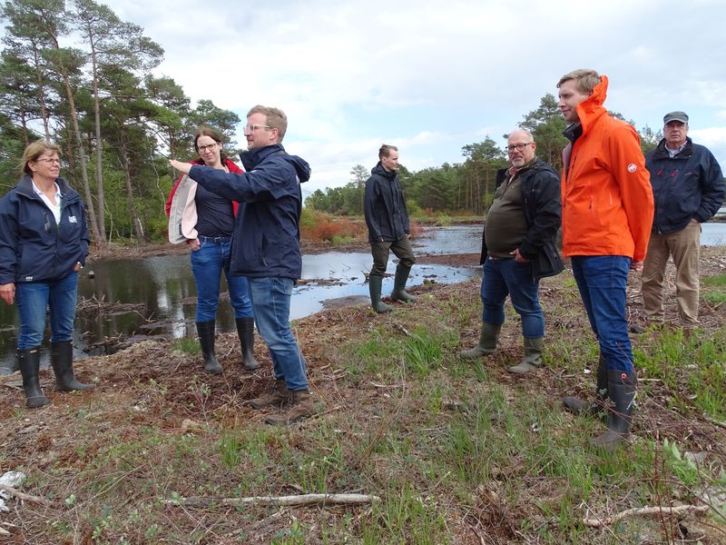 Projektförderungen mit EU-Mitteln sind gekoppelt an ein stringentes Berichtswesen zur Verwendung der Gelder. So wird es auch beim LIFE-Projekt gehandhabt. In der Vergangenheit wurde das Projekt einmal jährlich von einem durch die EU beauftragten externen Büro – vertreten durch Dr. Jan Sliva – besucht, und die Projektmitglieder um Projektmanagerin Susanne Brosch berichteten zum Fortschritt. Am 11. und 12. Juni dieses Jahres waren nun Vertreter der EU-KOM, Generaldirektion Umwelt, persönlich angereist, um sich zusammen mit Dr. Sliva zu informieren. Der für das LIFE-Programm zuständige Referatsleiter Santiago Urquijo Zamora und die ihm zugeordnete Finanzprüferin Päivi Rauma erhielten einen umfangreichen Input zur Finanzsituation und insbesondere zur Umsetzung der Maßnahmen in den vier betroffenen Mooren. Hier wurden zuletzt in großem Umfang Torfdämme zur Rückhaltung von Regenwasser gebaut und Entwässerungsgräben in den Mooren verschlossen. Aktuell wird darüber hinaus das Netz aus Gewässerpegeln und Grundwassermessstellen in den Mooren und um sie herum erneuert. Dieses Netz dient zur Feststellung von Veränderungen im Wasserhaushalt der Landschaft.