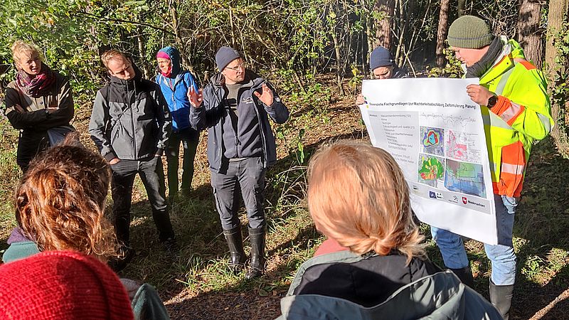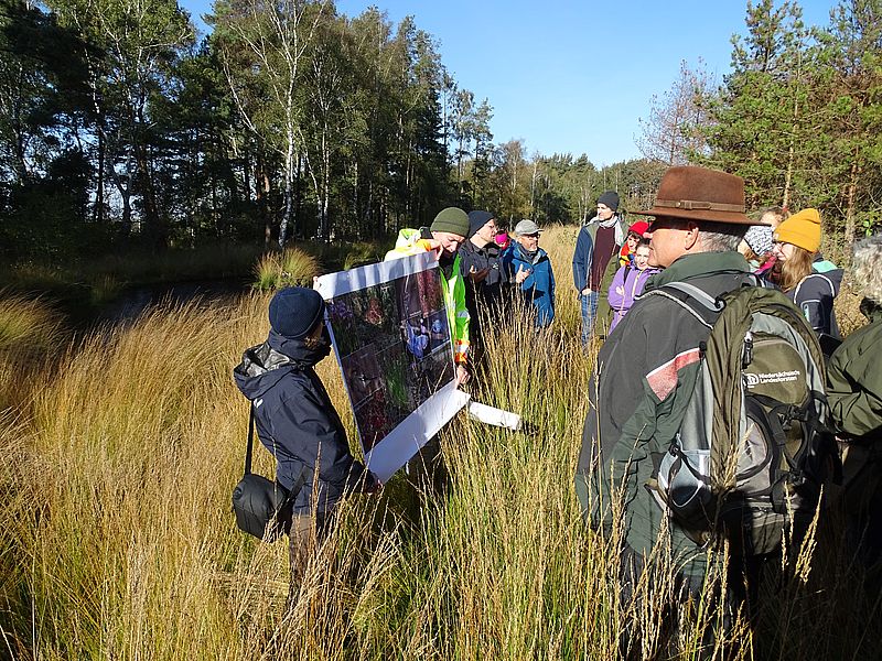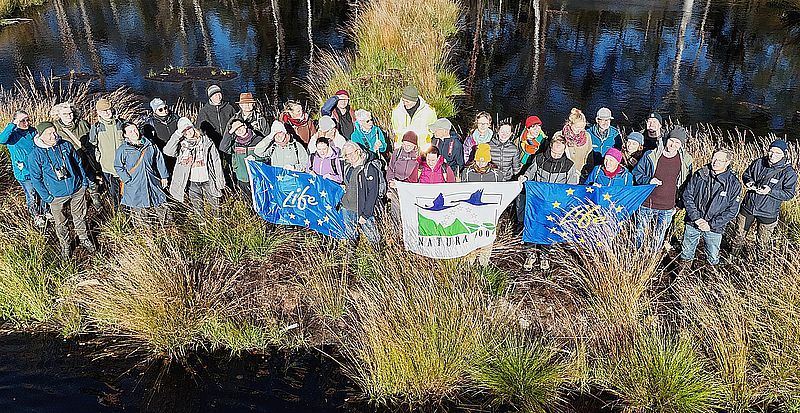 Die Beratungsstelle „Zukunft, Umwelt, Gesellschaft“ (ZUG) hatte alle deutschen LIFE-NAT-Projekte vom 15. bis 16.10. nach Hannover zu einem Vernetzungstreffen eingeladen und viele kamen. Der erste Tag diente dem Wissenstransfer zur Antragstellung und zu Neuerungen in der Projektabwicklung sowie dem Austausch von vielfältigen Erfahrungen. Der zweite Tag bot praktische Einblicke in den Moorschutz. Bei einer Geländeexkursion in das Otternhagener Moor konnten sich 35 interessierte Gäste vor Ort ein Bild zu den umfangreichen Baumaßnahmen und dem Erfolg der Wiedervernässung machen. Die Geschäftsbereiche Naturschutz und Planung und Bau des NLWKN berichteten dort aus ihrem langjährigen Erfahrungsschatz, der sich von der Planung bis zur aktuellen Umsetzungsphase angesammelt hat. Besichtigt wurden Grabenstaue, Moordämme und regelbare Überläufe. Die im Rahmen des Projektes hergestellten Dämme zum Regenwasserrückhalt boten auch die Möglichkeit, von dort aus einmal echten Schwingrasen im Moor zu betreten und hautnah zu erleben – das beeindruckte die Teilnehmer. Die Veranstaltungsleitung bedankte sich bei den Mitarbeitern des NLWKN für die gelungene Führung.