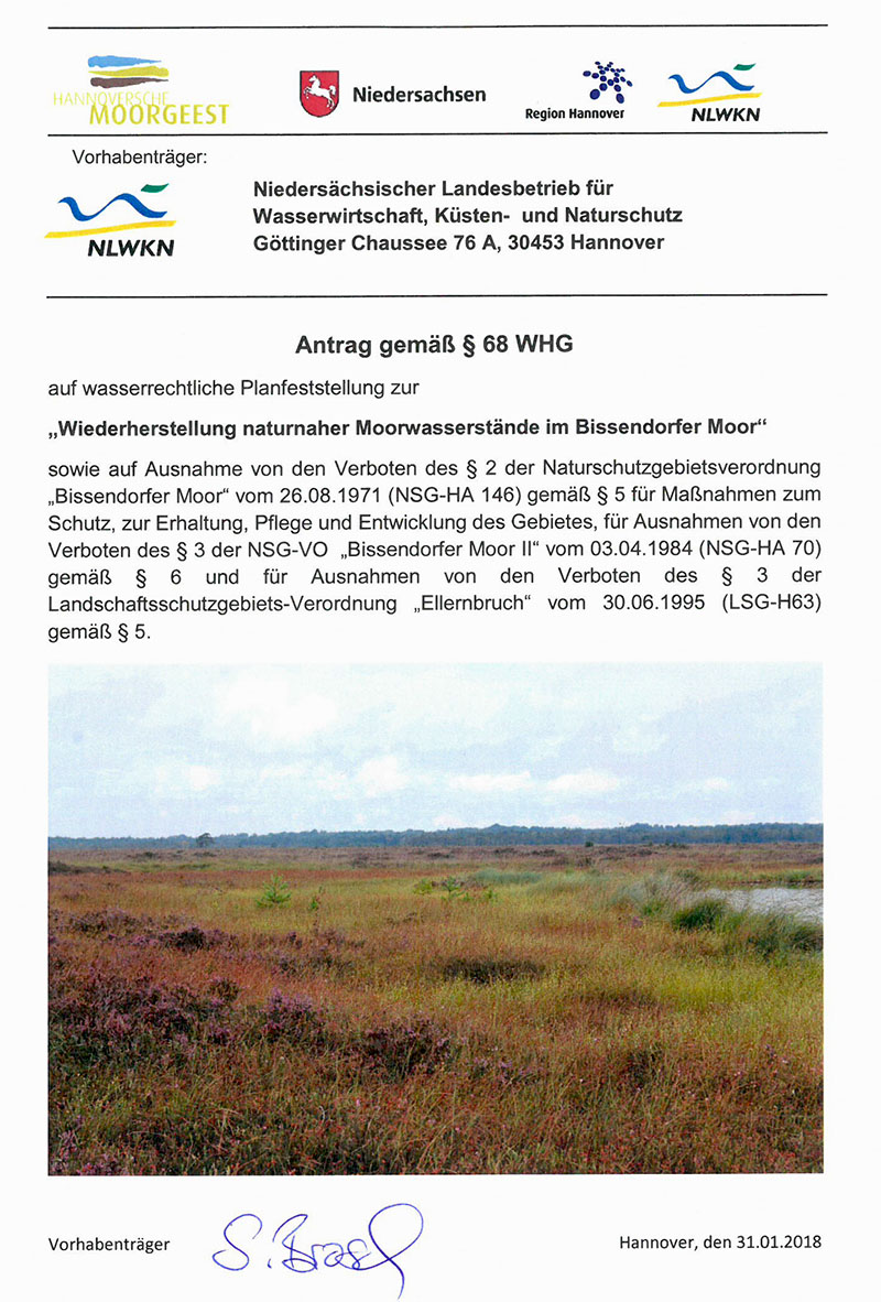 Nach Antragstellung durch den NLWKN im März 2018 (siehe Mitteilung vom März 2018) wurden die betroffenen Träger öffentlicher Belange und die anerkannten Naturschutzverbände im April-Mai 2018 beteiligt. Weiterhin konnte die Öffentlichkeit im Mai-Juni 2018 die bei der betroffenen Gemeinde Wedemark und der Stadt Langenhagen ausgelegten Planungsunterlagen einsehen.