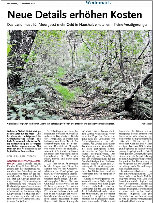 Darüber hinaus haben verbesserte Datengrundlage (Laserscanbefliegung und Vermessungen vor Ort) dazu geführt, dass die Berechnungen für erforderliche Dammlängen und Dammhöhen sowie Grabenverschlüsse gegenüber dem vorliegenden Pflege- und Entwicklungsplan weiter präzisiert werden konnten. Diese neuen technischen Daten sowie neue Erkenntnisse bei Verfahren zu Moorrenaturierungen wurden in die Überarbeitung der Kostenschätzung einbezogen. Daraus resultieren ebenfalls höhere veranschlagte Kosten bei der Bauausführung.