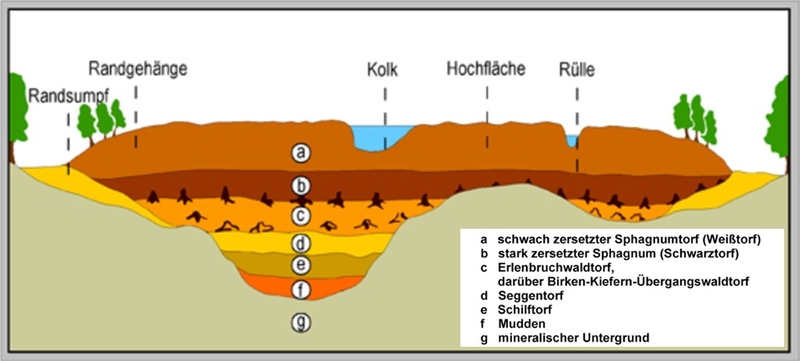 A raised bog is made up of various layers. The older and more subjacent a layer, the greater its degree of decomposition. The peat layers are differentiated into older, strongly decomposed black or sapric peat and younger and less decomposed white or fibric peat.