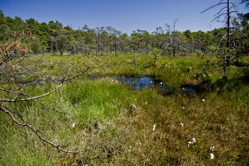 Raised bogs are, by nature, mostly treeless flat plateaus whose terrain comprises small areas of raised hummocks and lower-lying bog hollows. In individual cases they also feature natural small ponds or pools at their centre. At their periphery and near to the natural water areas there is undergrowth and vegetation, such as purple moor grass (Molinia caerulea), indicative of nutrients and periodically wet conditions.