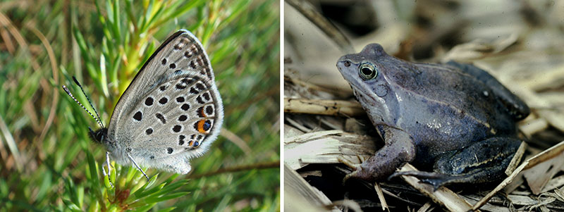 Raised bogs are irreplaceable as wetland habitats and sanctuaries for many species of fauna and flora. Certain groups of fauna species such as snails, mussels or fish, on the other hand, are totally absent. The wet, nutrient-poor and acidic environment has enabled a biocenosis of closely interdependent flora and fauna communities to develop. These highly specialised communities include numerous, particularly endangered species worthy of protection. In some cases, the name of these species already indicates their close association with the marshland habitat, such as bog asphodel (Narthecium ossifragum), moor frog (Rana arvalis) or cranberry blue (Plebejus optilete).