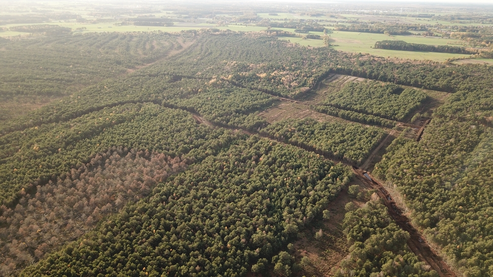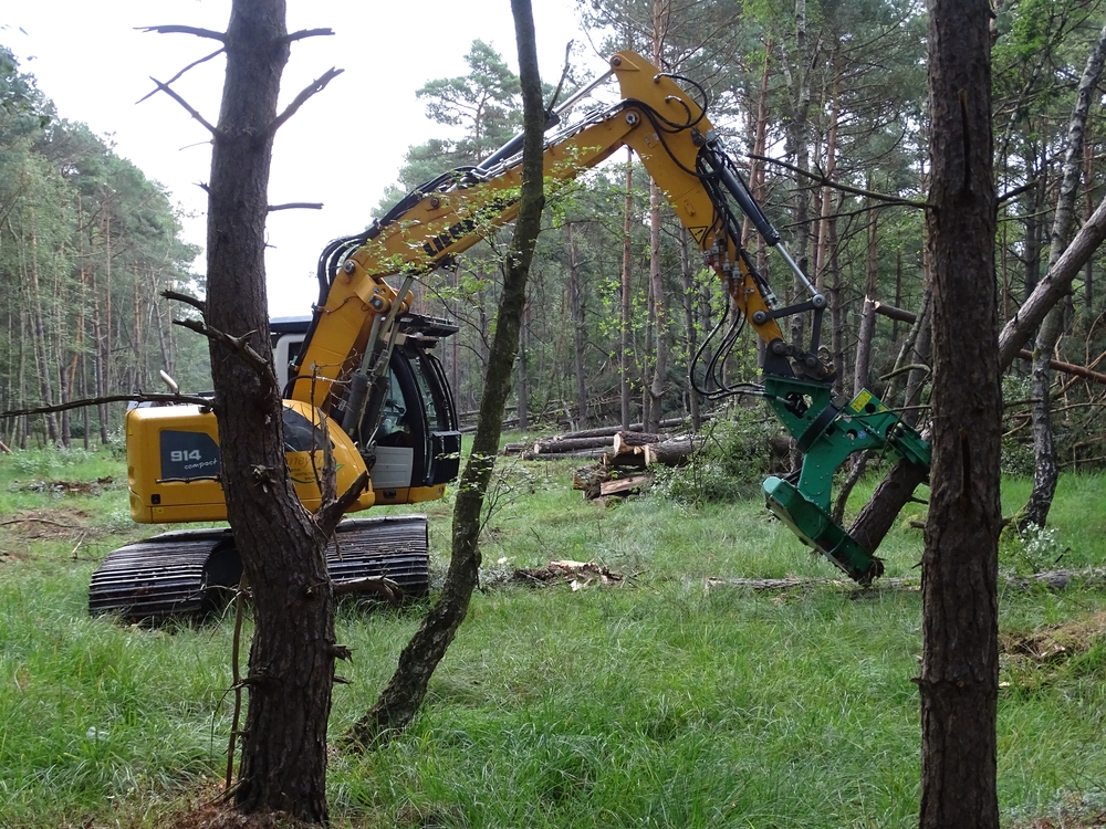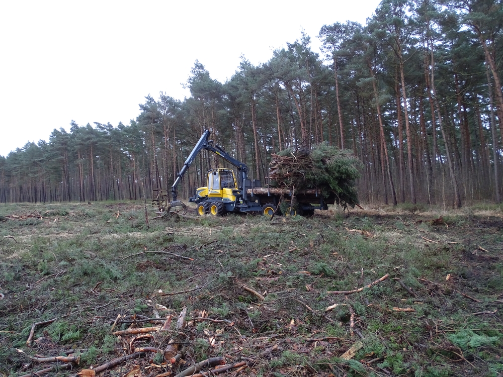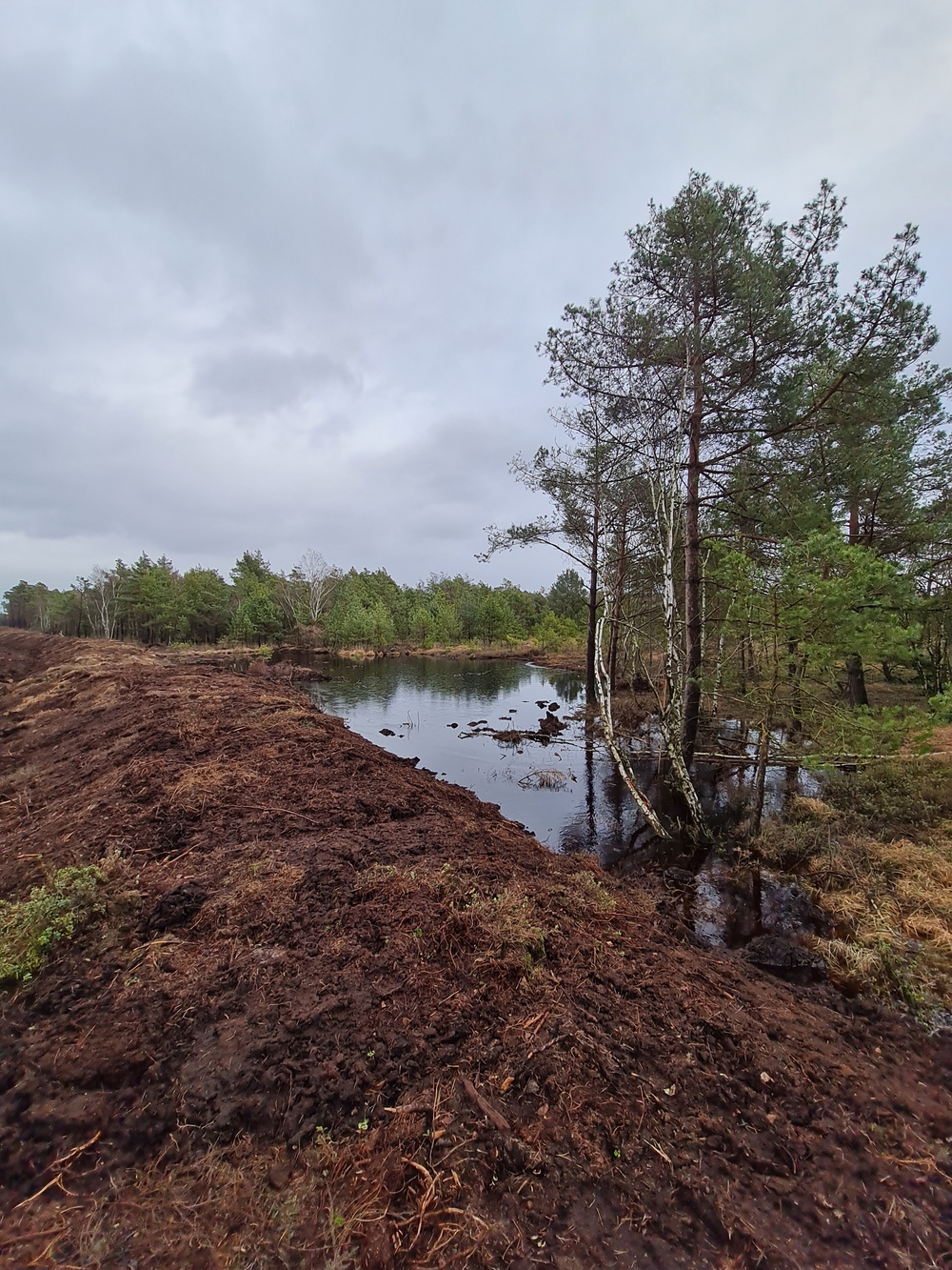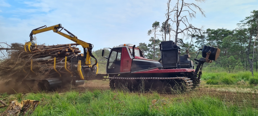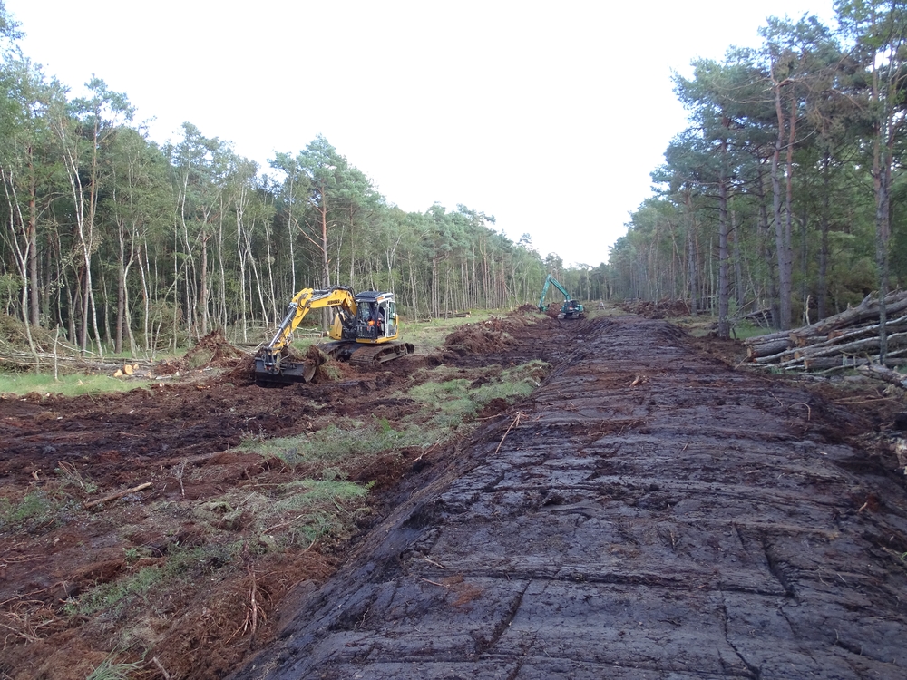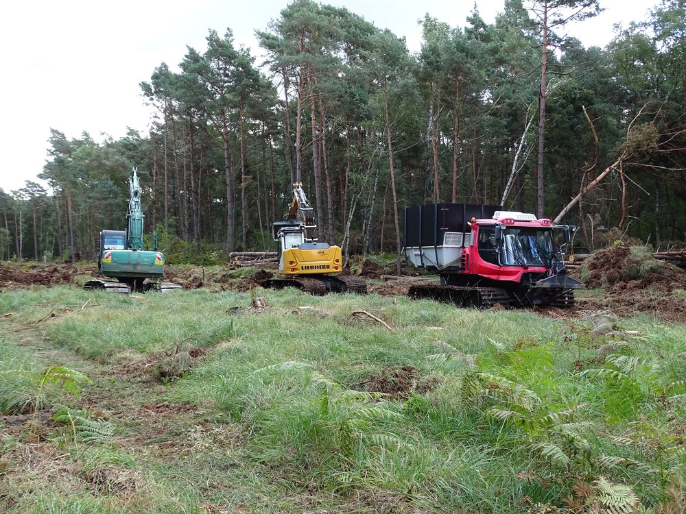 Im September 2021 starteten die ersten bauvorbereitenden Maßnahmen. Im Außenbereich des Moores wurden Gehölze entfernt um dort anschließend Moordämme aufzubauen. Im Randbereich ist die Torfmächtigkeit relativ gering, wodurch hier das Holz komplett abgefahren werden konnte und für die weitere Verwertung genutzt werden kann.