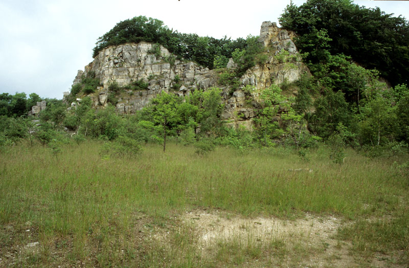 Halbtrockenrasen mit Aufkommen von Pioniergehölzen in aufgelassenem Kalksteinbruch, im Hintergrund anthropogene Kalkfelsflur; Thüster Berg bei Salzhemmendorf; A6.95; RHP.v [FFH 6210] / RGK.n; Foto: O. v. Drachenfels