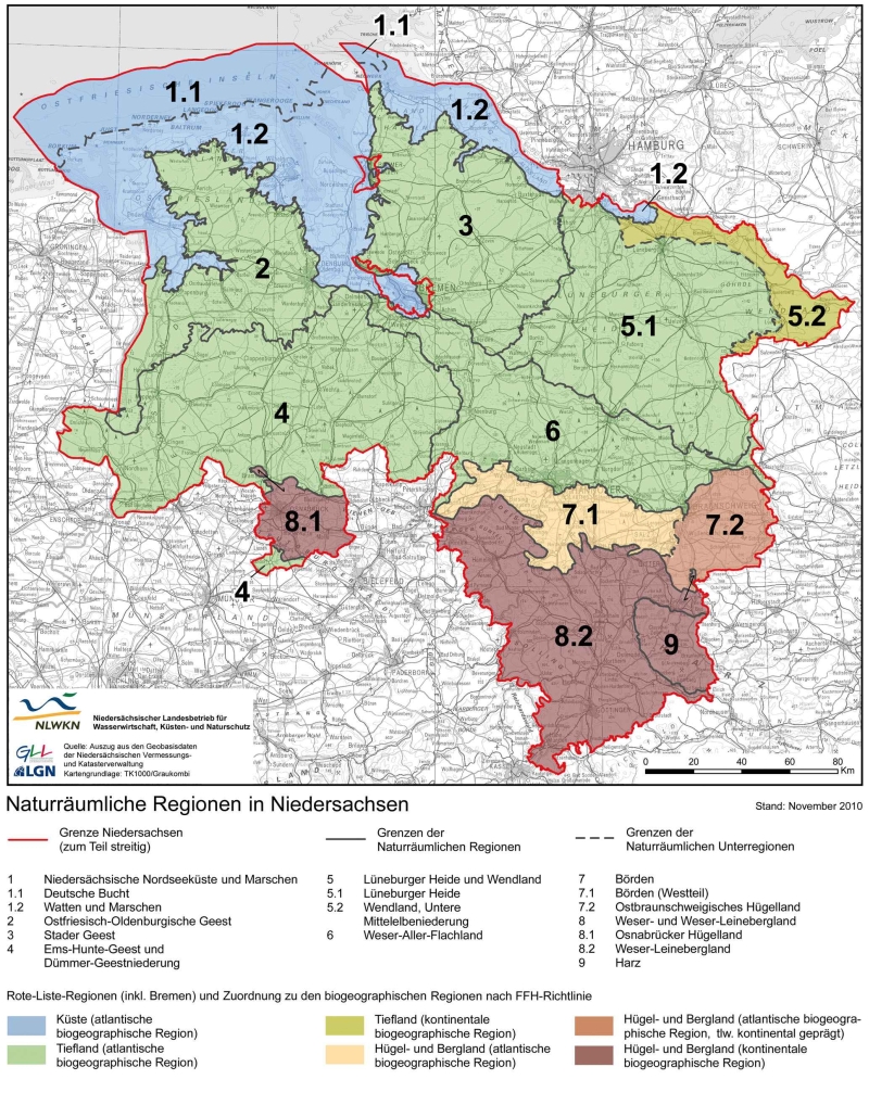 Die Naturräumlichen Regionen und ihre Abgrenzungen, die Rote-Liste-Regionen*) sowie die biogeographischen Regionen sind im Informationsdienst Naturschutz Niedersachsen 4/2010 näher erläutert: