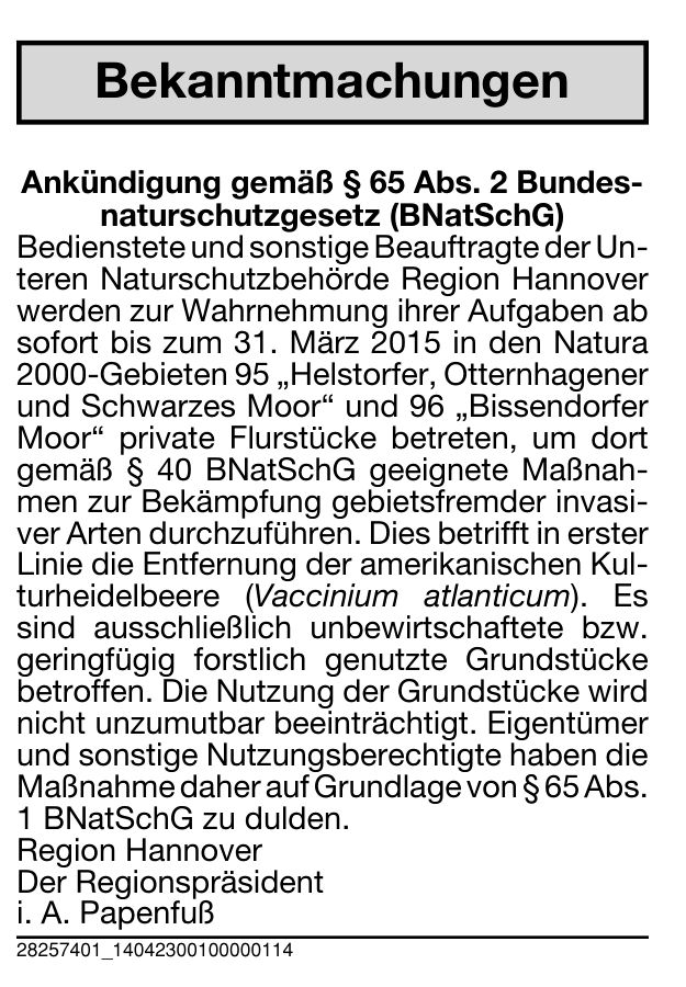 Aufgrund der kleinteiligen Parzellierung der Flurstücke und der sehr weit fortgeschrittenen Ausbreitung der Kulturheidelbeere können sich praktisch auf jedem Grundstück einzelne Keimlinge bis großbuschige Bestände befinden. Die untere Naturschutzbehörde der Region Hannover hat nach § 40 Bundesnaturschutzgesetz die konkrete gesetzliche Verpflichtung zur Bekämpfung von invasiven Neophyten. Für eine effektive Bekämpfung müssen nicht nur die Flurstücke in öffentlichem Eigentum, sondern zwingend auch alle betroffenen privaten Flurstücke einbezogen werden. Die Eigentümer haben solche Maßnahmen im Rahmen der Sozialpflichtigkeit zu dulden. Da es lediglich um die Entfernung einzelner Kulturheidelbeeren auf weitgehend ungenutzten Moorgrundstücken geht, wird niemand unzumutbar beeinträchtigt.