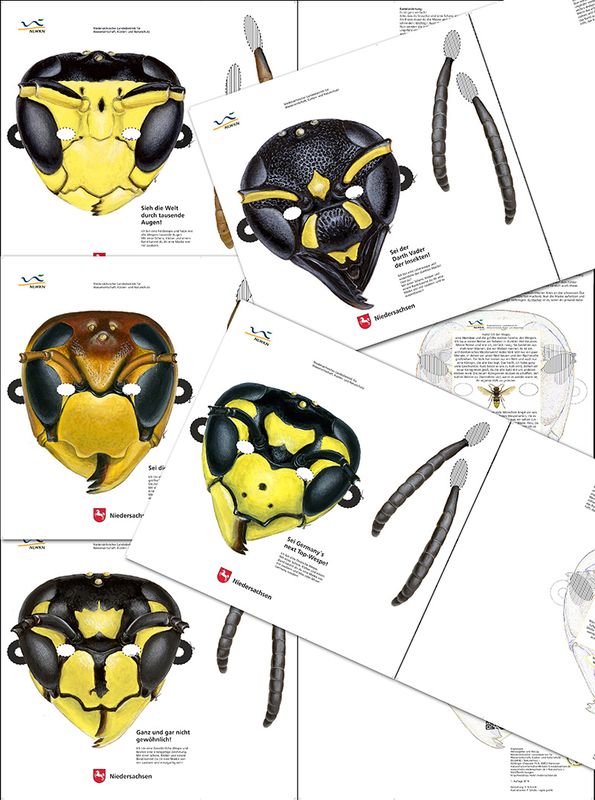 5 verschiedene Kindermasken von Wespenköpfen, zum Ausschneiden mit Infos über Wespen auf der Rückseite, einzeln unter Angabe von Nr./Motiv bestellbar, kostenlos, bei größeren Mengen bitte Verwendungszweck angeben