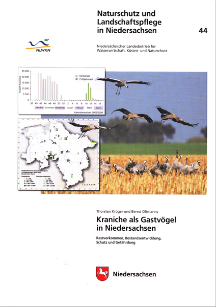 Darüber hinaus kamen mit der Bestandserholung in Niedersachen, Ostdeutschland, Ost- und Nordeuropa auch immer mehr Kraniche außerhalb der Brutzeit auf ihrem Zug in die südlichen Winterquartiere sowie auf dem Heimzug im Frühjahr nach Niedersachsen. Kraniche ziehen seit jeher auf schmaler Front über Niedersachsen hinweg. Dabei existierten nur wenige etablierte Rastgebiete und Zwischenrastplätze, die von den Vögeln regelmäßig frequentiert werden, um zu rasten und sich für den Weiterflug zu stärken. Abseits dieses Zugkorridors traten Kraniche dagegen zumeist nur bei für sie ungünstigen Witterungsbedingungen und beispielsweise daraus resultierender Verdriftung auf. Inzwischen bieten ihnen jedoch die vor allem im Rahmen des Niedersächsischen Moorschutzprogramms entstandenen, weiten und störungsarmen Feuchtlebensräume ideale Rastmöglichkeiten, wodurch sich sowohl die Zahl der in Niedersachsen rastenden Kraniche enorm erhöht hat, als auch der Zugkorridor derzeit eine Aufweitung erfährt und einige neue Rastgebiete und Zwischenrastplätze entstanden sind. Von dieser bis dato noch nicht tiefer gehend analysierten, ebenfalls überaus positiven und erfreulichen Entwicklung bei Kranichen in Niedersachsen handelt dieses Heft.
