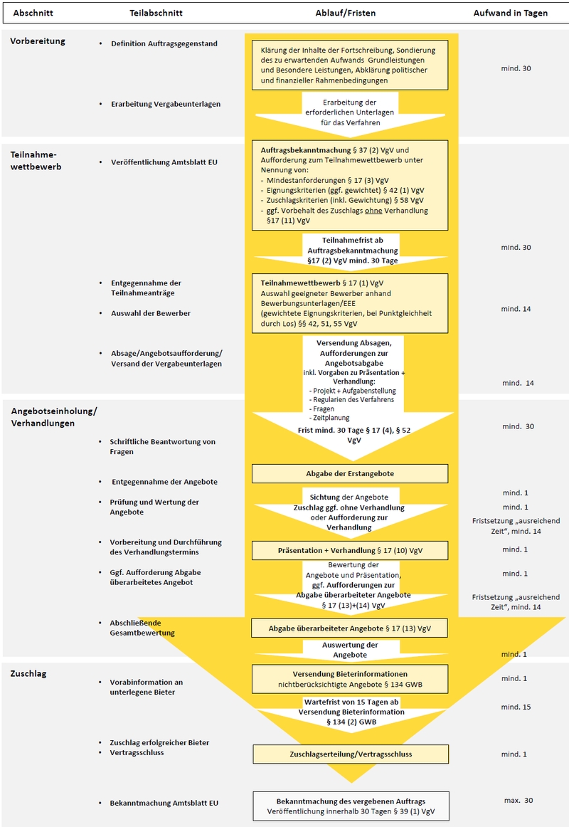 Der Ablauf und die Elemente des Vergabeverfahrens werden durch das Gesetz gegen Wettbewerbsbeschränkungen (GWB) und besonders die Verordnung über die Vergabe öffentlicher Aufträge (VgV) geregelt und in der vorliegenden Hinweissammlung „fahrplanmäßig“ beschrieben, mit Bezug zu den Anforderungen der Verordnung über die Honorare für Architekten- und Ingenieurleistungen (HOAI).