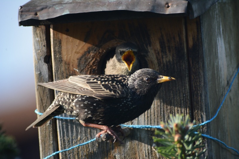 Nicht nur auf den Emswiesen können jetzt wieder junge, graubraune Stare neben den schwarzgefärbten Altvögeln beobachtet werden. Sie entstammen der diesjährigen Erstbrut, die, soeben flügge, bereits nach wenigen Tagen selbständig nach Futter sucht.