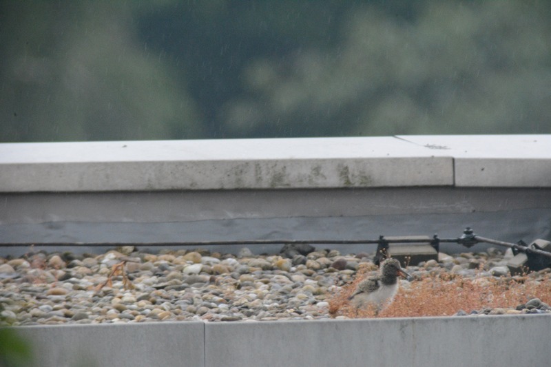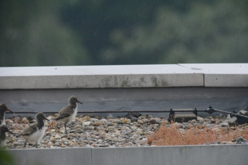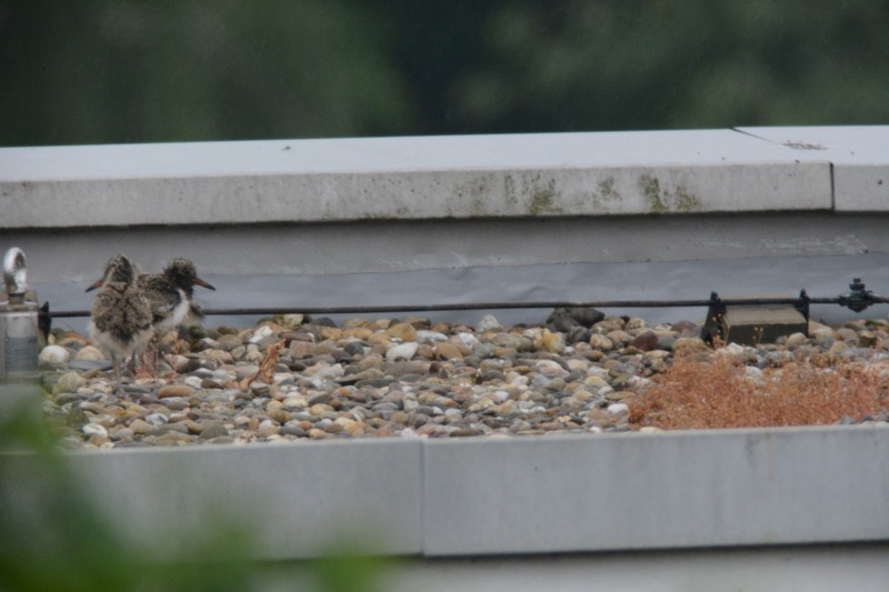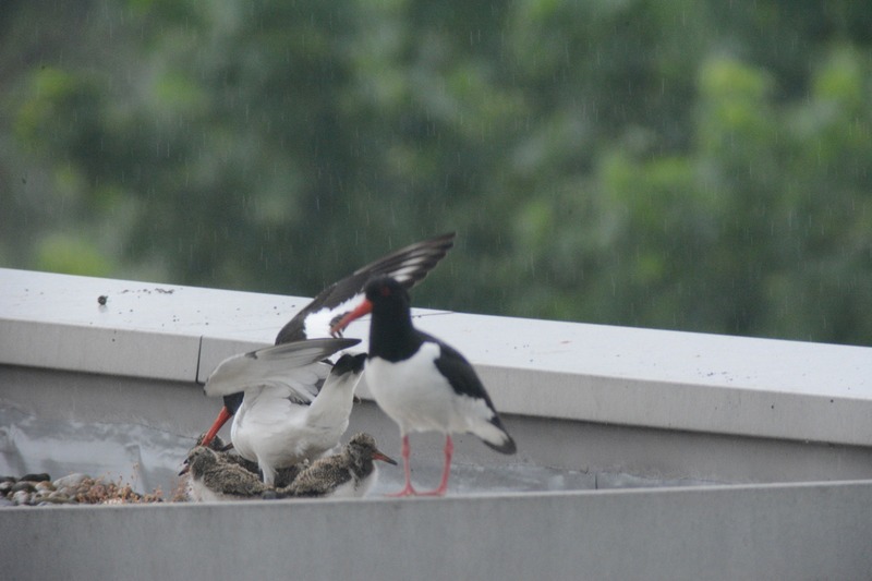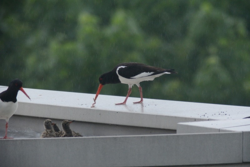 Knapp 6 Wochen nach der Entdeckung brütender Austernfischer auf einem innenstadtnahen Flachdach in Leer konnte heute erstmals „Schlupferfolg“ vermeldet werden: 4 Küken flitzten über die ca. 400 m² große Fläche zum Futter-eintragenden Altvogel am Dachrand. Austernfischergelege umfassen im Schnitt drei Eier. Vier erfolgreich geschlüpfte und anscheinend sehr vitale Küken stellen auch angesichts des ungewöhnlichen Aufzuchtbiotops ein bislang bemerkenswertes Ergebnis dar. Wir bleiben dran!