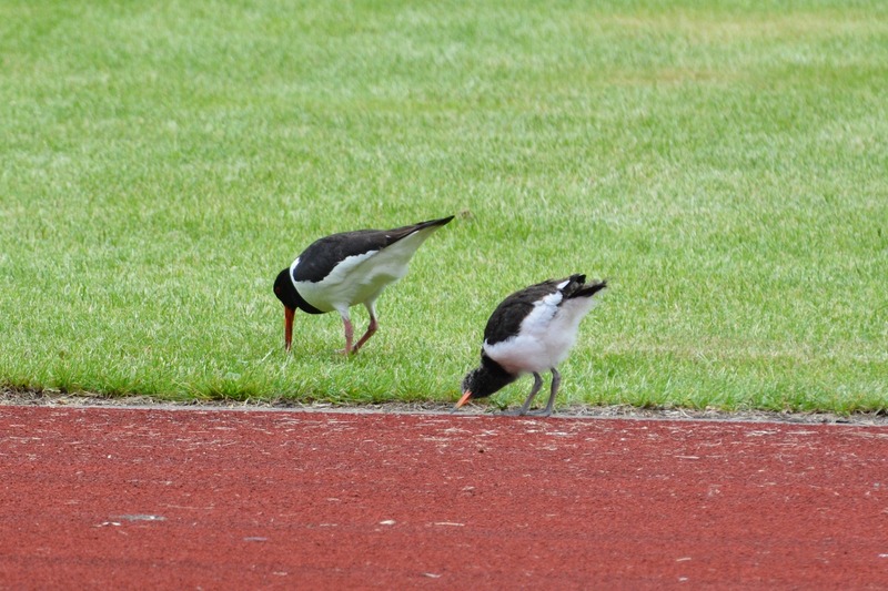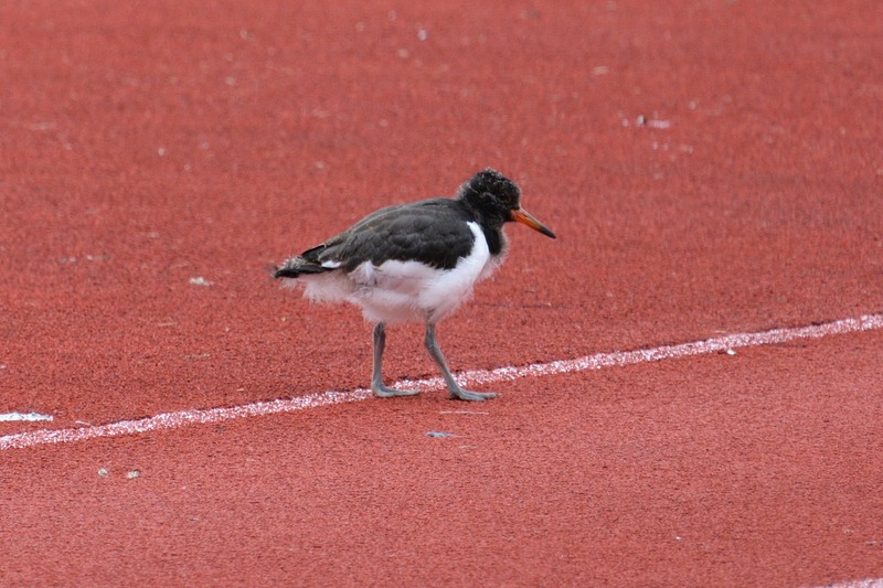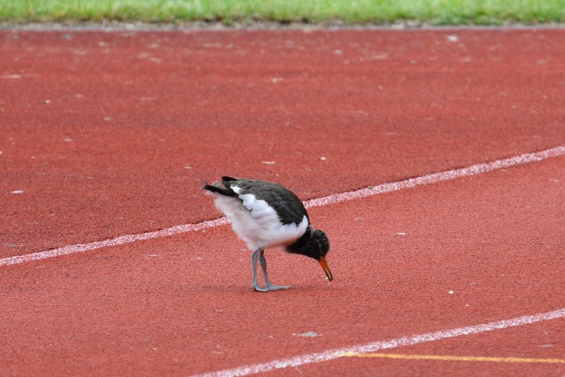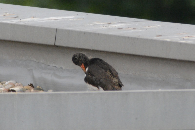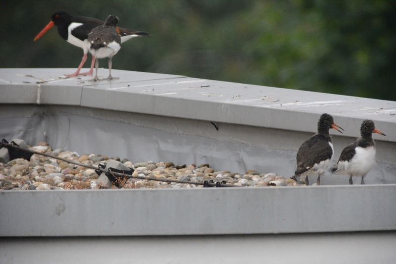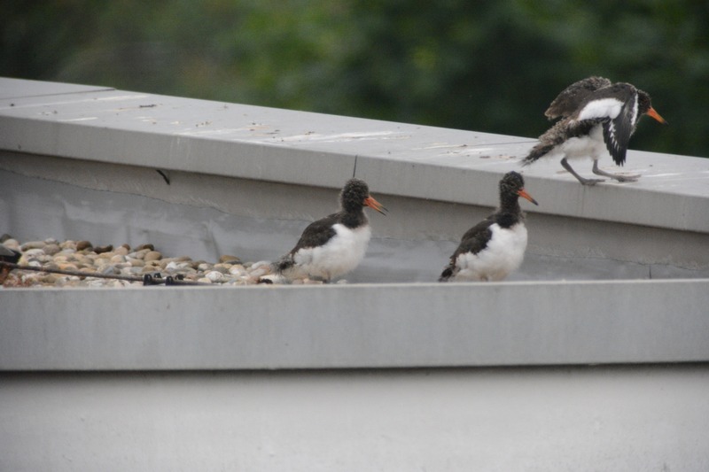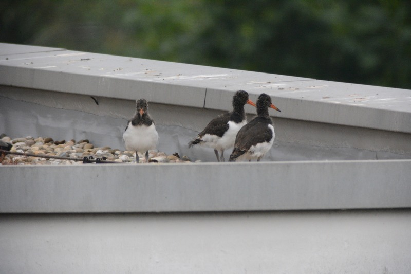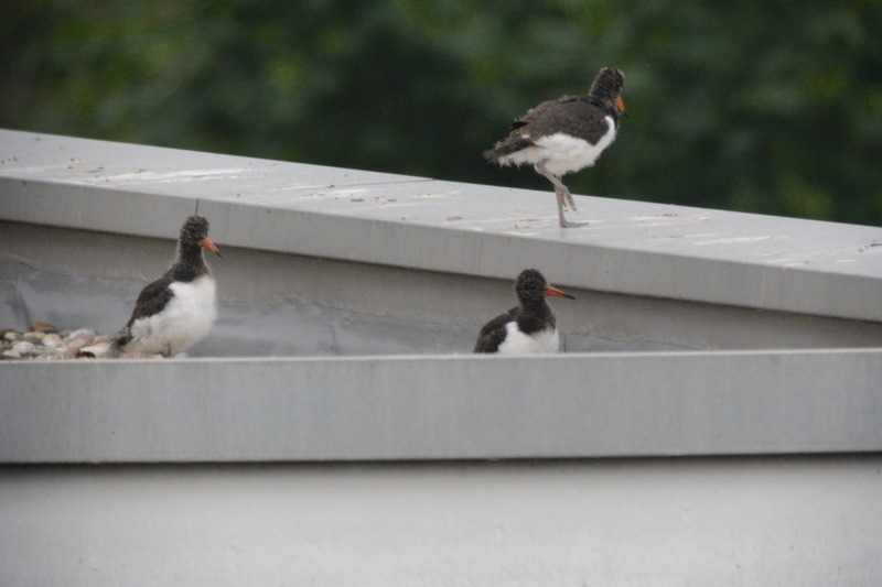 Seit Mitte April verfolgen die Mitarbeiter der Naturschutzstation das Geschehen rund um ein Austernfischerpaar auf einem naheliegenden Hochhaus-Flachdach (siehe ältere Kurzmitteilungen von April bis Juni). Am Dienstag vergangener Woche schien der „Abflug“ der drei Küken unmittelbar bevorzustehen (siehe unten). Und tatsächlich: nur zwei Tage später fand sich der erste Jungvogel auf dem nur etwa 200 m entfernten Sportplatz der Friesenschule wieder. Von dort hatten die Altvögel wochenlang Würmer und Insektenlarven zum Flachdach getragen.