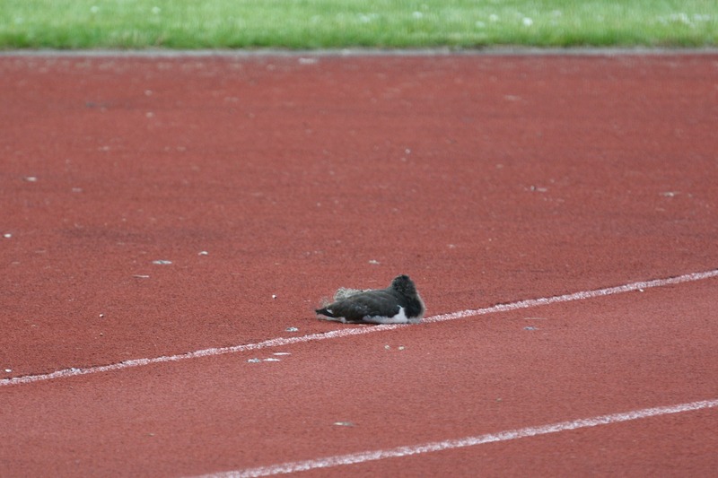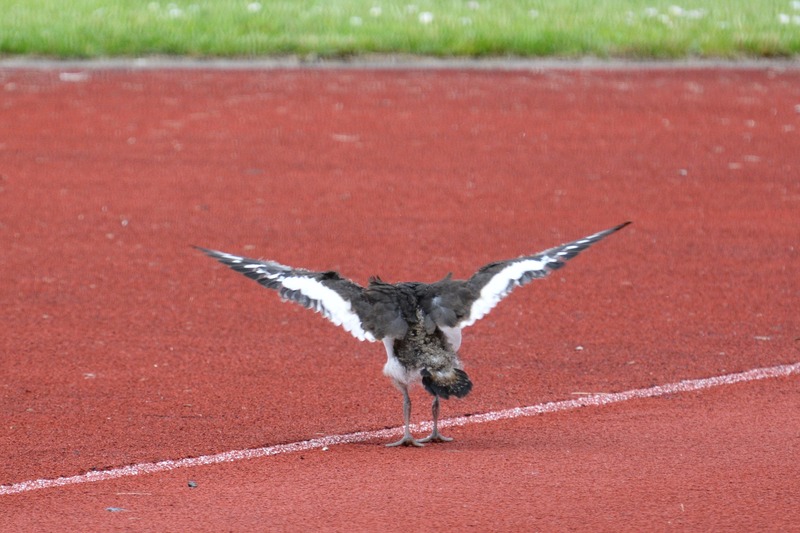Die beiden verbliebenen Küken hockten derweil dicht beieinander auf dem Dach, allem Anschein nach wurden sie nicht mehr gefüttert. Einen Tag später, am Freitag, war dann ein zweiter Jungvogel mit seinen Eltern auf dem Rasenplatz zu beobachten, der dritte verharrte weiter auf dem Hochhaus. Die Familie auf dem Sportplatz störte sich nicht sonderlich am laufenden Sportunterricht, gemeinsam stocherten sie in der Grasnarbe nach Essbarem.