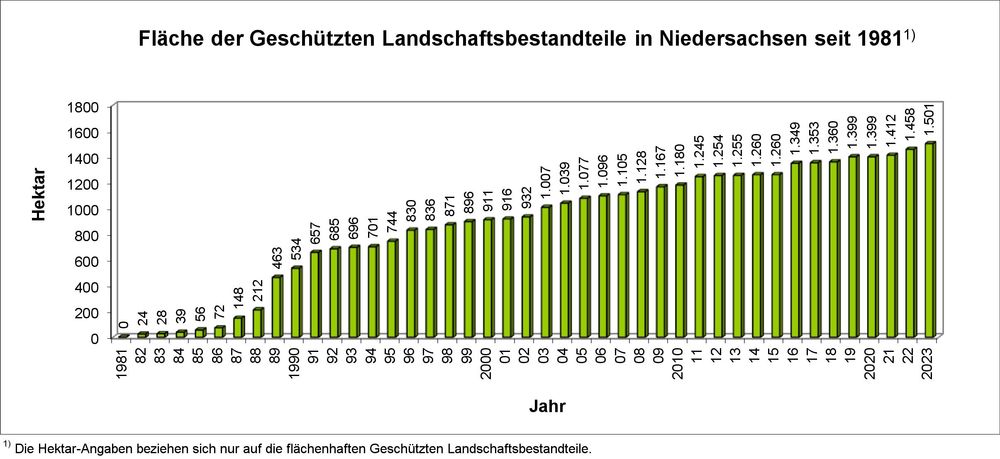 Die nachfolgende Grafik zeigt die Entwicklung der Flächengröße aller flächenhaften Geschützten Landschaftsbestandteile in Niedersachsen seit 1981. Erkennbar ist, dass es in diesem Zeitraum zu einer kontinuierlichen Zunahme der Fläche Geschützter Landschaftsbestandteile kam.