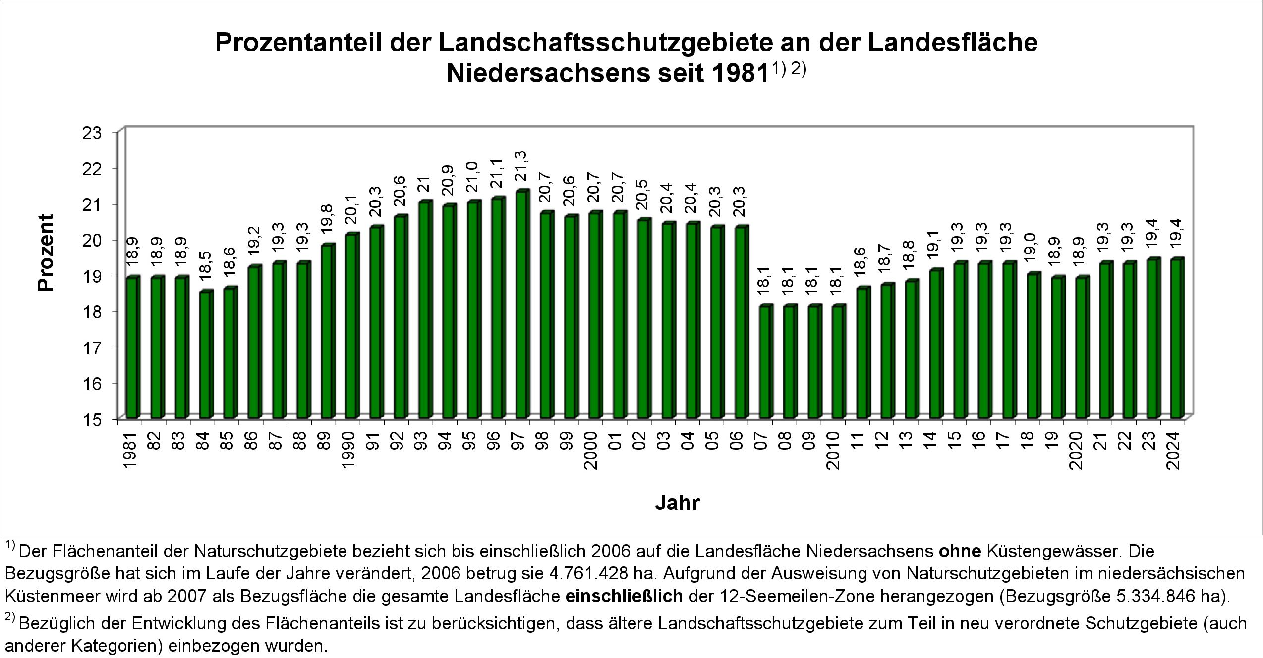 Die nachfolgende Grafik zeigt die jährliche Veränderung des prozentualen Anteils der Landschaftsschutzgebiete an der Landesfläche Niedersachsens seit 1981. Erkennbar ist, dass es in diesem Zeitraum in der Regel zu einer Zunahme der Fläche von Landschaftsschutzgebieten kam. Sie nehmen nunmehr einen Flächenanteil von 19,4 % der Landesfläche (einschließlich der 12-Seemeilen-Zone) ein.