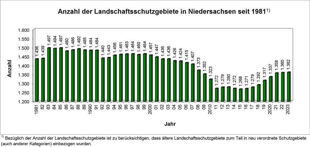 In Niedersachsen liegen Landschaftsschutzgebiete sowohl in flächenhafter Ausprägung als auch als auch in schmaler Längsausdehnung vor. Die nachfolgende Grafik zeigt die Entwicklung der Gesamtanzahl der Landschaftsschutzgebiete (LSG) in Niedersachsen seit 1981. Erkennbar ist, dass es in diesem Zeitraum überwiegend zu einer Abnahme kam. Dabei ist zu berücksichtigen, dass ältere Landschaftsschutzgebiete zum Teil in neu verordnete Schutzgebiete auch anderer Kategorien einbezogen wurden.
