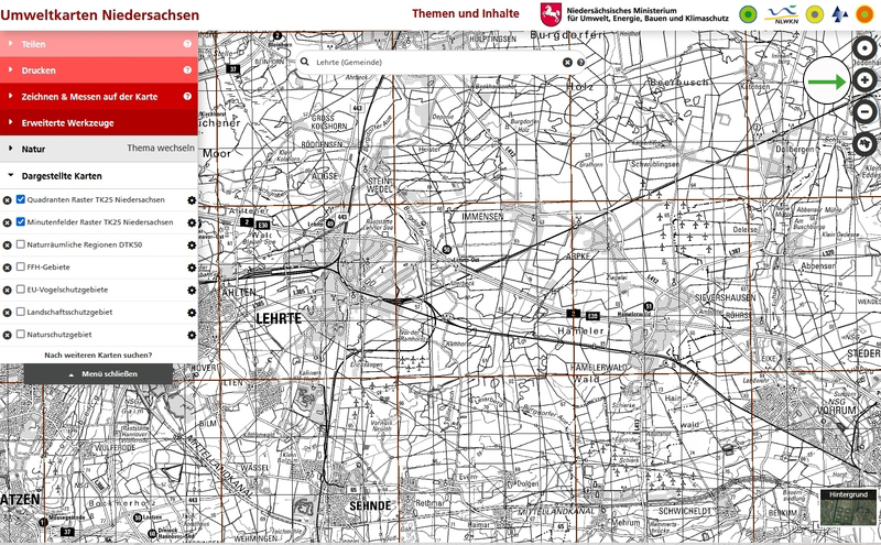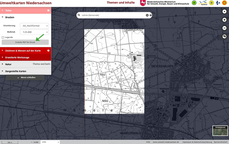 Sollten Sie das digitale Programm nicht nutzen können, können Sie die benötigten Karten direkt aus den "Umweltkarten Niedersachsen" erstellen, als PDF abspeichern und ggf. ausdrucken. Dabei sind Kartenausschnitt, Maßstab und zusätzlicher fachlicher Inhalt individuell auswählbar.