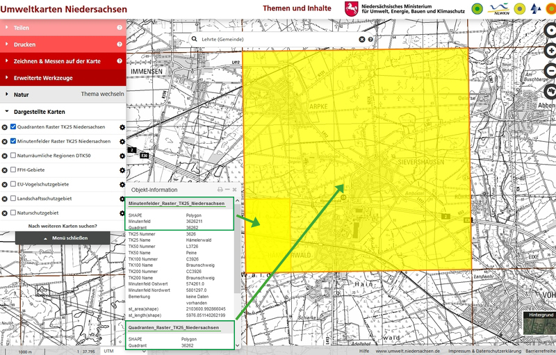 Über den nachfolgenden Link öffnen sich die Umweltkarten Niedersachsen, wobei zwei für die Meldung wichtige Inhalte voreingestellt und sichtbar sind: