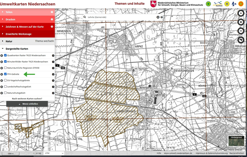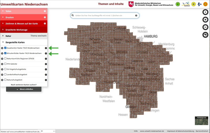 Über den nachfolgenden Link öffnen sich die Umweltkarten Niedersachsen, wobei zwei für die Meldung wichtige Inhalte voreingestellt und sichtbar sind: