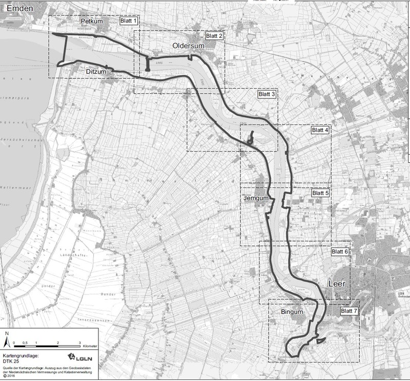(3) Die Grenze des NSG ergibt sich aus den Karten im Maßstab 1 : 10 000 (Anlage 2) und aus der Übersichtskarte im Maßstab 1 : 60 000 (Anlage 1). Sie verläuft auf der Innenseite des dort dargestellten grauen Rasterbandes. Die Karten sind Bestandteil dieser Verordnung. Sie können von jedermann bei den Gemeinden Jemgum, Moormerland, Westoverledingen, beim Landkreis Leer, bei der Stadt Leer, der Stadt Weener und der Stadt Emden sowie beim NLWKN, Betriebsstelle Brake-Oldenburg, unentgeltlich eingesehen werden.