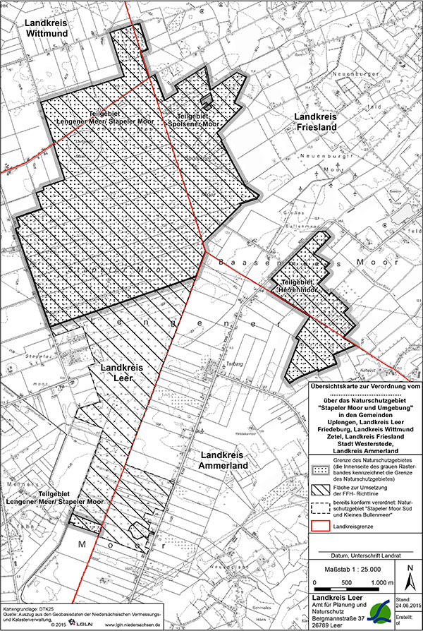 Beachten Sie bitte, dass sich das Naturschutzgebiet über vier Landkreise erstreckt und damit in den Zuständigkeitsbereich von vier Unteren Naturschutzbehörden fällt. Die hier hinterlegte Verordnung ist die des Landkreises Leer. Die Verordnungen der anderen Landkreise sind inhaltlich identisch.