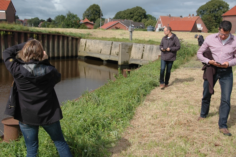 Das im „Masterplan Ems 2050" enthaltene Maßnahmenpaket beinhaltet auch eine Verbesserung der ökologischen Durchgängigkeit von Sielen, Schleusen und Schöpfwerken. Mit der Umsetzung dieser Projekte ist der Aufgabenbereich Gewässerbewirtschaftung/ Flussgebietsmanagement der Betriebsstelle Aurich betraut. Leiterin Anke Joritz und Gewässerbiologe Dr. Oliver-David Finch besprachen am 07.09.2015 entsprechende Realisierungsmöglichkeiten mit Jeroen Huisman von der VHL University of Applied Sciences in Leeuwarden und Peter Paul Schollema von der Waterschap Hunze en Aa's.