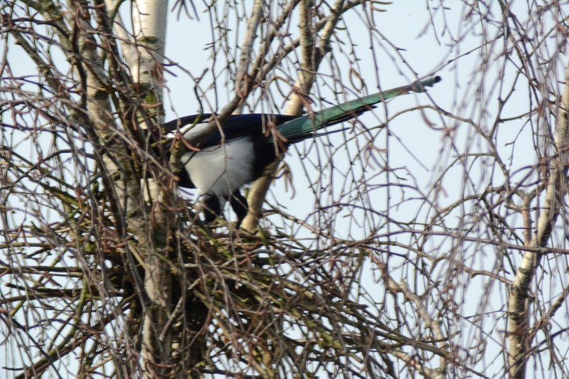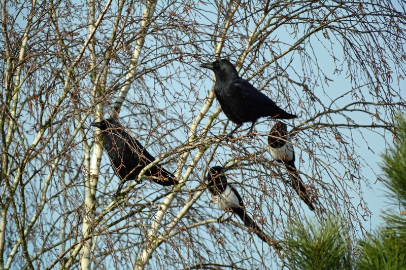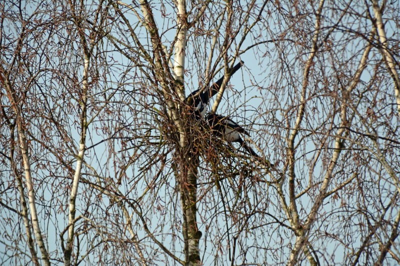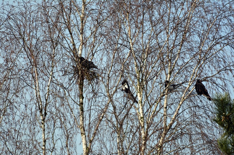 Deutlich früher als viele andere Singvögel beginnen Vertreter der Krähenverwandten ihr Brutgeschäft im zeitigen Frühling. So hatte in den ersten Märztagen auch ein Elsterpärchen in einer hochgewachsenen Birke gegenüber der Naturschutzstation mit dem Nestbau begonnen. Ein nicht nur von den Mitarbeitern beobachtetes Unterfangen, denn kürzlich erschienen wiederholt zwei Rabenkrähen am halbfertigen Nest, größere Verwandte und Konkurrenten der Elstern. Die Krähen hockten sich neben oder sogar in den Nistplatz und wehrten Vertreibungsversuche der Elstern mit überlegenen Schnabelhieben ab. Immer wieder „besuchten" die Krähen die Birke und blieben mehrere Minuten bis zu einer halben Stunde. Schließlich verließen die Elstern die Baustelle und starteten einen weiteren Versuch in einem entfernt stehenden Baum. Offensichtlich nur zum Schein, denn seit Mitte dieser Woche, vielleicht erschien ihnen die Luft wieder „rein", bauen sie erneut am alten Nest.
