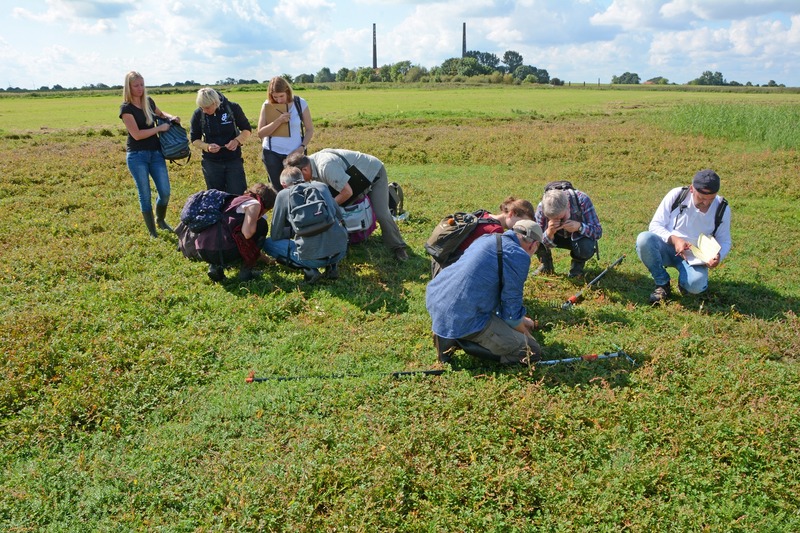 Am Sonntagmorgen, den 03. September trafen sich 15 Pflanzenkundler aus ganz Niedersachsen am Gebäude der künftigen Naturschutzstation Ems am Sauteler Siel in Terborg. Die ehrenamtlichen und professionellen Botaniker folgten einer Einladung der Hannoveraner Kollegen vom Geschäftsbereich Landesweiter Naturschutz. Diese veranstalten alljährlich mehrere Exkursionen in floristisch besonders interessante Gebiete Niedersachsens. Das letzte Kartierertreffen dieses Jahres hatte nun die Brackwasser-Salzwiesen an der Unterems zum Ziel. Zunächst ging es auf die linke Emsseite ins Midlumer Deichvorland. Schön ausgeprägt fanden sich hier die typischen, extensiv beweideten Brackwasser-Flutrasen und –Salzwiesen der Flussmündungen. Nach einer Mittagspause wurden dann „die Seiten gewechselt“: Im Petkumer Deichvorland auf der rechten Emsseite untersuchte die Gruppe die ausgedehnten Salzwiesen zwischen Deich und Uferkante.