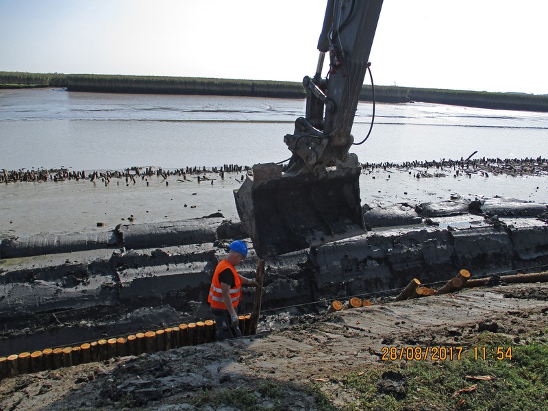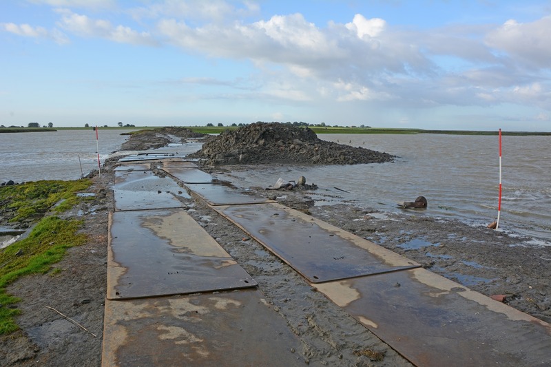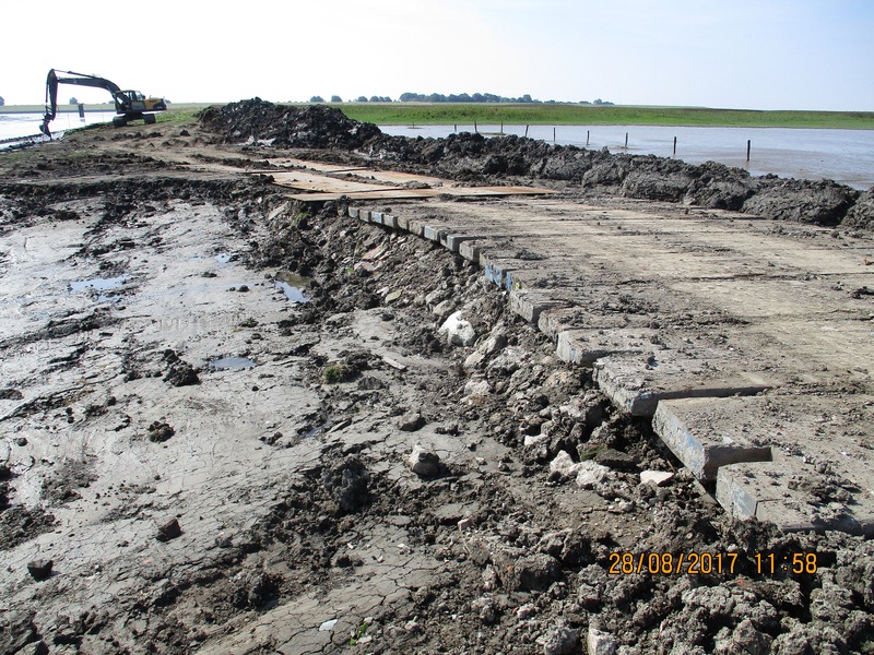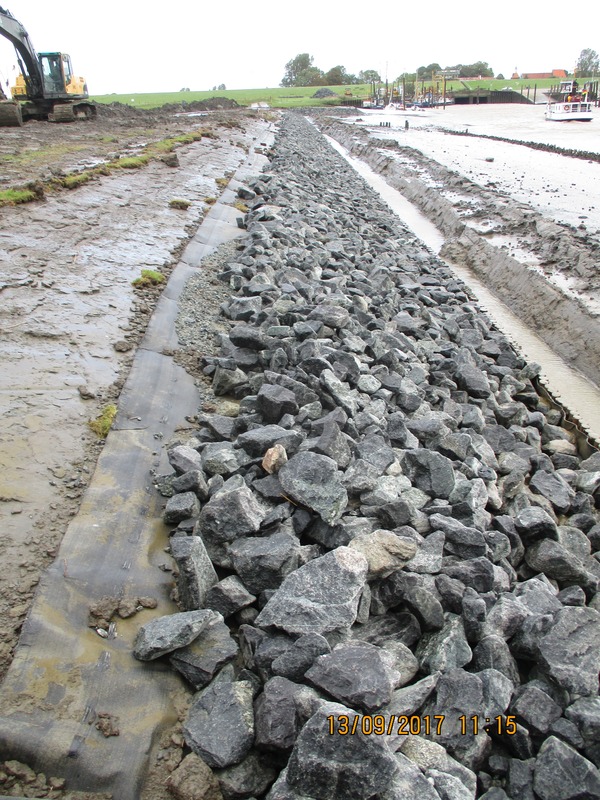 Trotz schwieriger Bedingungen im unmittelbaren Tidebereich kommen die Instandsetzungsarbeiten am Petkumer Siel gut voran. Der parallel zur Außenmuhde verlaufende Weg, der als einziger Zugang für das Weidevieh dient, war durch abgängige Befestigungen und Kolke nahezu unpassierbar geworden. Die extensive Beweidung der Naturschutzflächen ist aber eine wichtige Voraussetzung für den Erhalt der überaus reichen Vogelfauna des Gebietes. Bis Anfang Oktober sollen die Arbeiten abgeschlossen sein. Trotz mehreren Unterbrechungen, die Sturm und Gewitter, Tide-Hochwasser und Dauerregen erzwangen, ist Bauingenieurin Ulrike Hessing von der Betriebsstelle Norden noch optimistisch, dass die Arbeiten wie vereinbart Anfang Oktober fertiggestellt werden können. Die Projektleitung der Naturschutzmaßnahme liegt bei der Betriebsstelle Oldenburg, die Naturschutzstation Ems leistet die ökologische Baubegleitung in diesem sensiblen Gebiet.