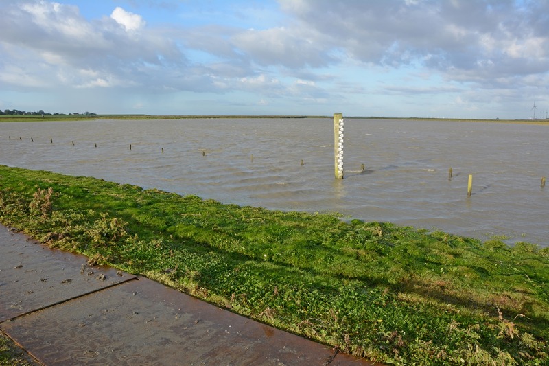 Wir verabschieden uns und die Wissenschaftler tuckern weiter zur nächsten Probestrecke. Es ist windstill, die Sonne dringt langsam durch den Hochnebel und lässt die Wasserflächen in der Rückdeichung silbrig schimmern. Ein Kormoran überfliegt uns Richtung Westen, zur Ems. Wir folgen ihm, zurück zur Station in Leer.