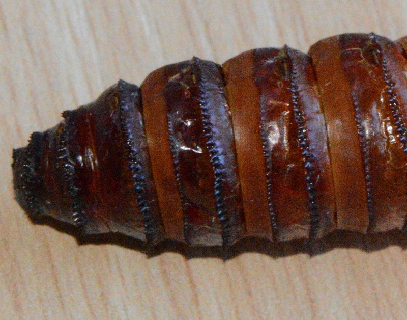 Zufallsbeobachtung: Bei einem mittäglichen Spaziergang im Naherholungs- und Landschaftsschutzgebiet Windelkampsweg in Leer „lief“ den Mitarbeitern der Naturschutzstation eine stattliche, gut sieben Zentimeter lange Raupe über den Weg. Es handelte sich um eine ausgewachsene Larve des Weidenbohrers auf ihrem Weg zum Überwinterungs- und Verpuppungsort. Die beidseits des Weges stehenden alten Kopfweiden bieten dieser Nachtfalterart zusagende Lebensräume, im vergangenen Jahr wurde in der Nähe bereits eine leere Puppenhülle gefunden (siehe Abbildung).