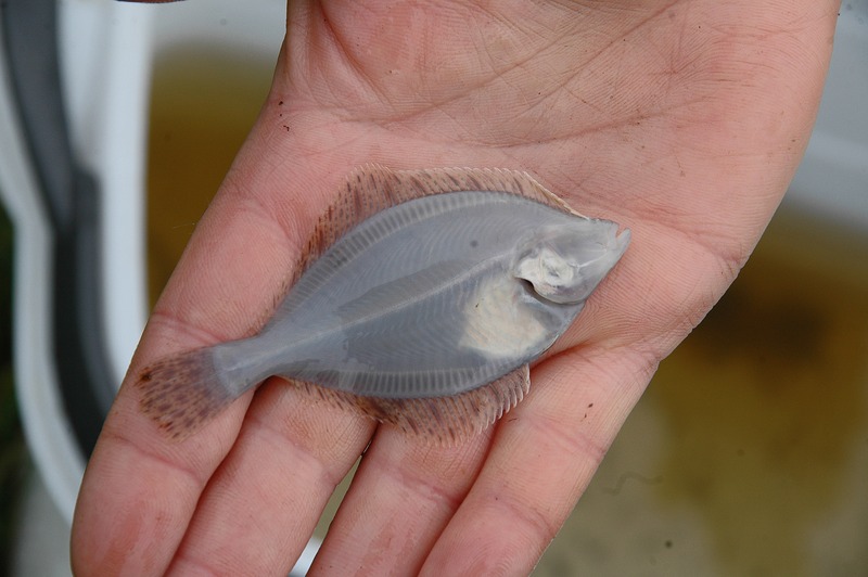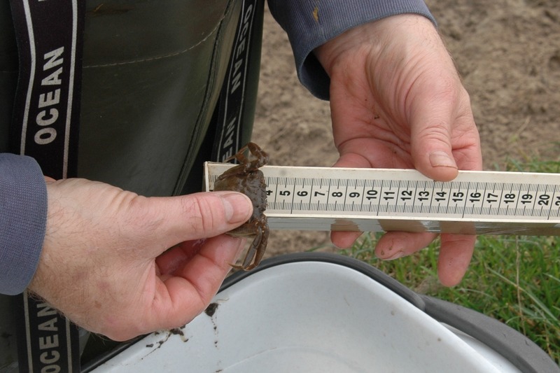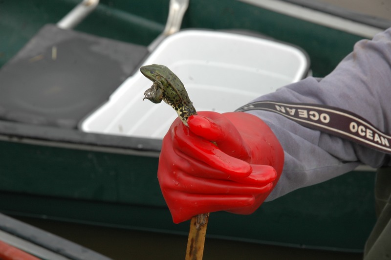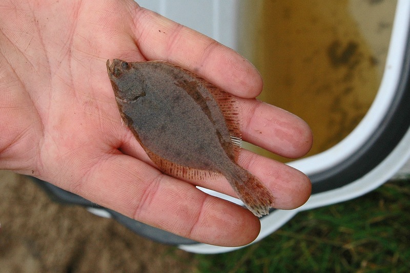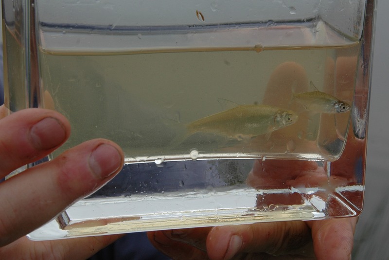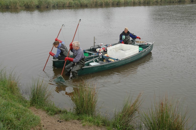 Wir bleiben an Land, schauen dem Gefährt vom Deich aus nach. Links fließt das Aper Tief mit dem Flutstrom flussaufwärts, rechts erstreckt sich die weite Wasserfläche der Rückdeichung. Nach ca. 200 m Fahrt wendet das Boot, die Befischung beginnt. Gegen die Strömung bewegt es sich am Ufer entlang langsam auf uns zu. Während die Kollegin weiter von Bord arbeitet, springt Hehmann mit Wathose ins Wasser und durchkämmt die Uferzone mit seinem Kescher. Der Steuermann hält Kurs am Außenborder, bedient gleichzeitig aber auch den Generator. Fisch im Netz heißt „Strom aus!“, dabei haben die Biologen Mühe, den Lärm der Motoren zu übertönen.