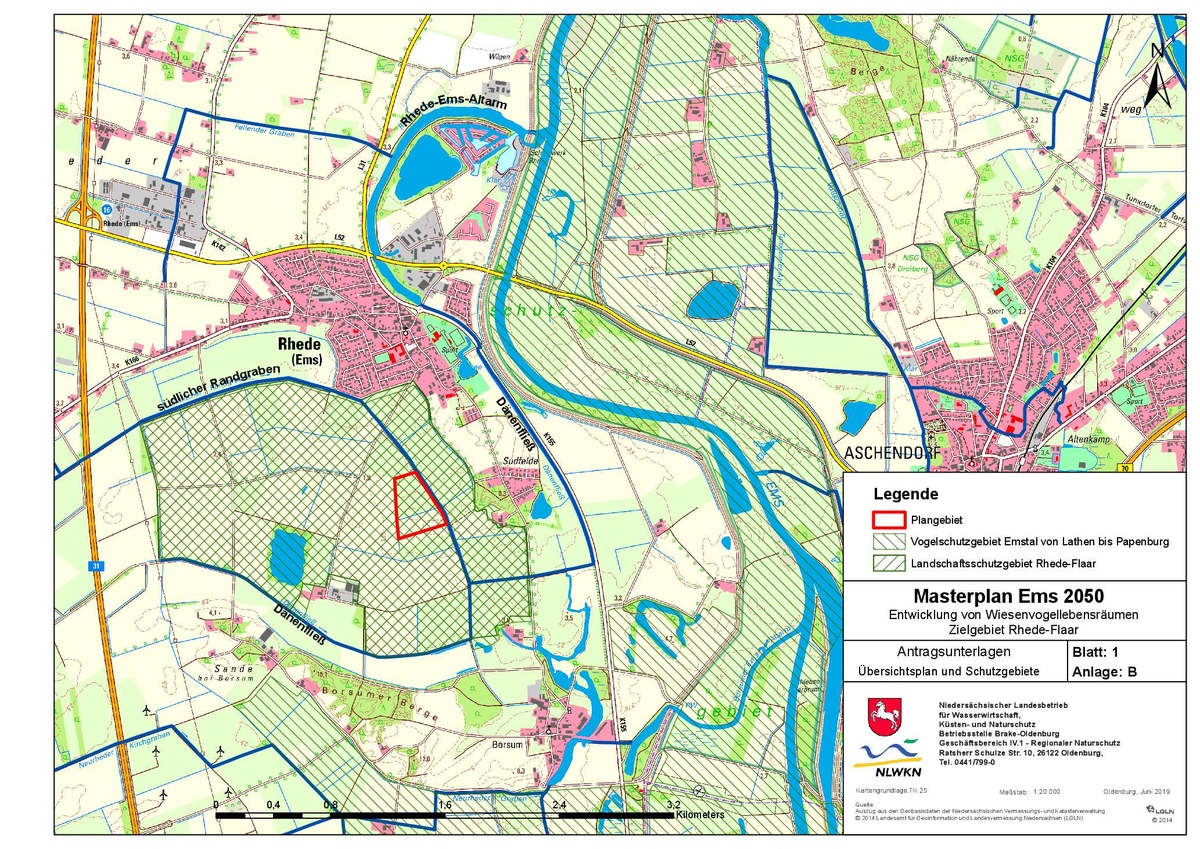 Das Plangebiet umfasst ca. 11 ha landeseigene Fläche und ist südlich der Ortschaft Rhede (Ems) im Landschaftsschutzgebiet „Rhede-Flaar“ gelegen, das Bestandteil des Vogelschutzgebietes „Emstal von Lathen bis Papenburg“ ist. Der Flächenankauf durch das Land Niedersachsen erfolgte im Plangebiet im Rahmen des Masterplan Ems 2050.